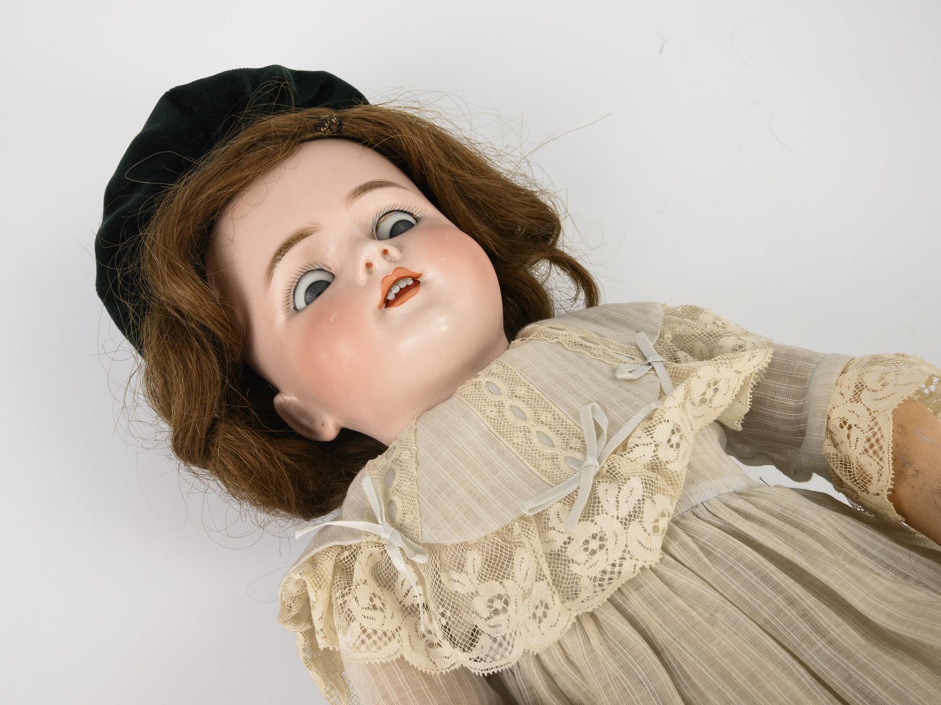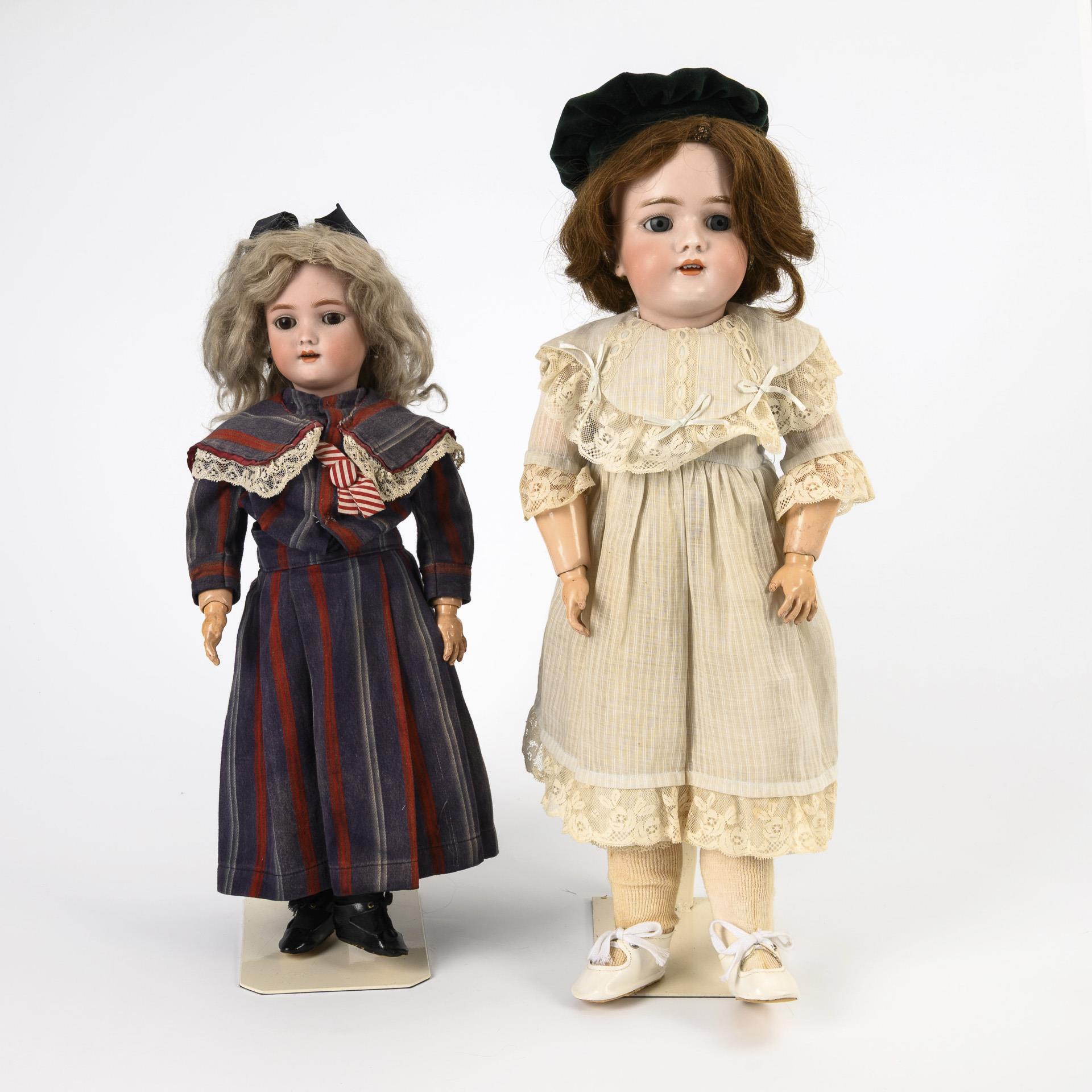 Beide mit Kurbelkopf, Schlafaugen und 15-teiligem Gliederkörper. Zierliche Blonde mit Mohairperücke und gestreiftem Kleid. L 45 cm. / Größere Puppe mit brauner Echthaarperücke, weißem Kleid und grünem Samtbarett. Minimaler Perückenpull, rechter Arm mit Trockenriss. L 52 cm. Köpfe durchleuchtet: ohne Defekte.