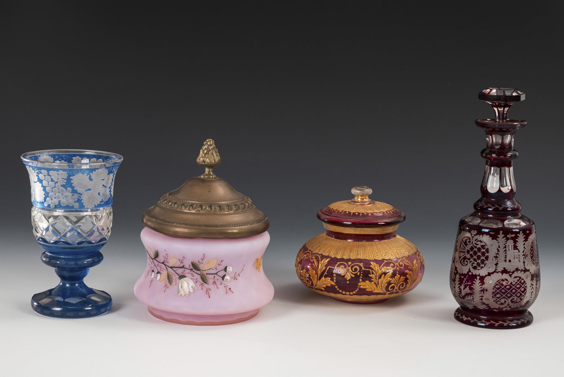 1x Flakon aus farblosem, rot gebeiztem Glas mit Rocaillegravur (H 19 cm). / 1x Dose aus farblosem Glas mit Rosalininnenfang sowie Email- und Reliefgolddekor (H 9,5 cm). / 1x Dose aus Opalglas mit rosa Innenfang, Klarglasüberfang, floraler Emailmalerei und Metalldeckel (H 14 cm). / 1x Kelchglas aus farblosem, teils blau gebeiztem Glas mit Steinelschliff und gravierten Weintrauben und -blättern (H 13 cm). Chip am Karaffenrand und am Rand eines Dosendeckels, 3 kleine Chips an 1 Dosenrand.