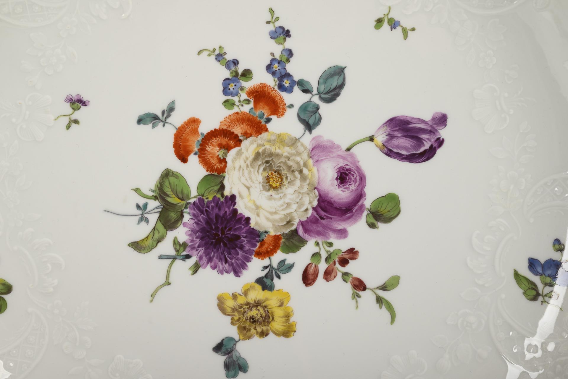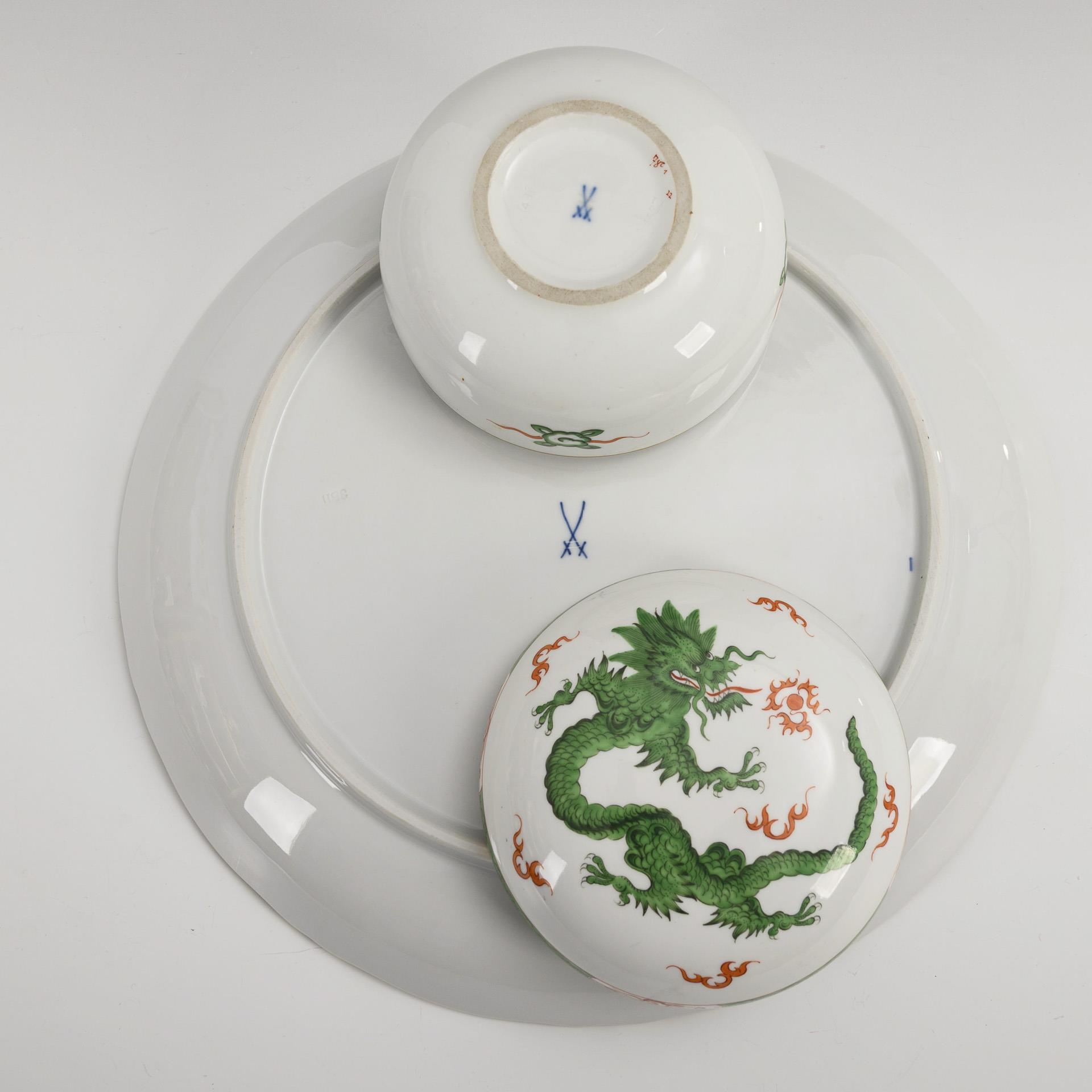 Kredenzteller mit Blumenmalerei und Dose mit Drachendekor. Meissen.