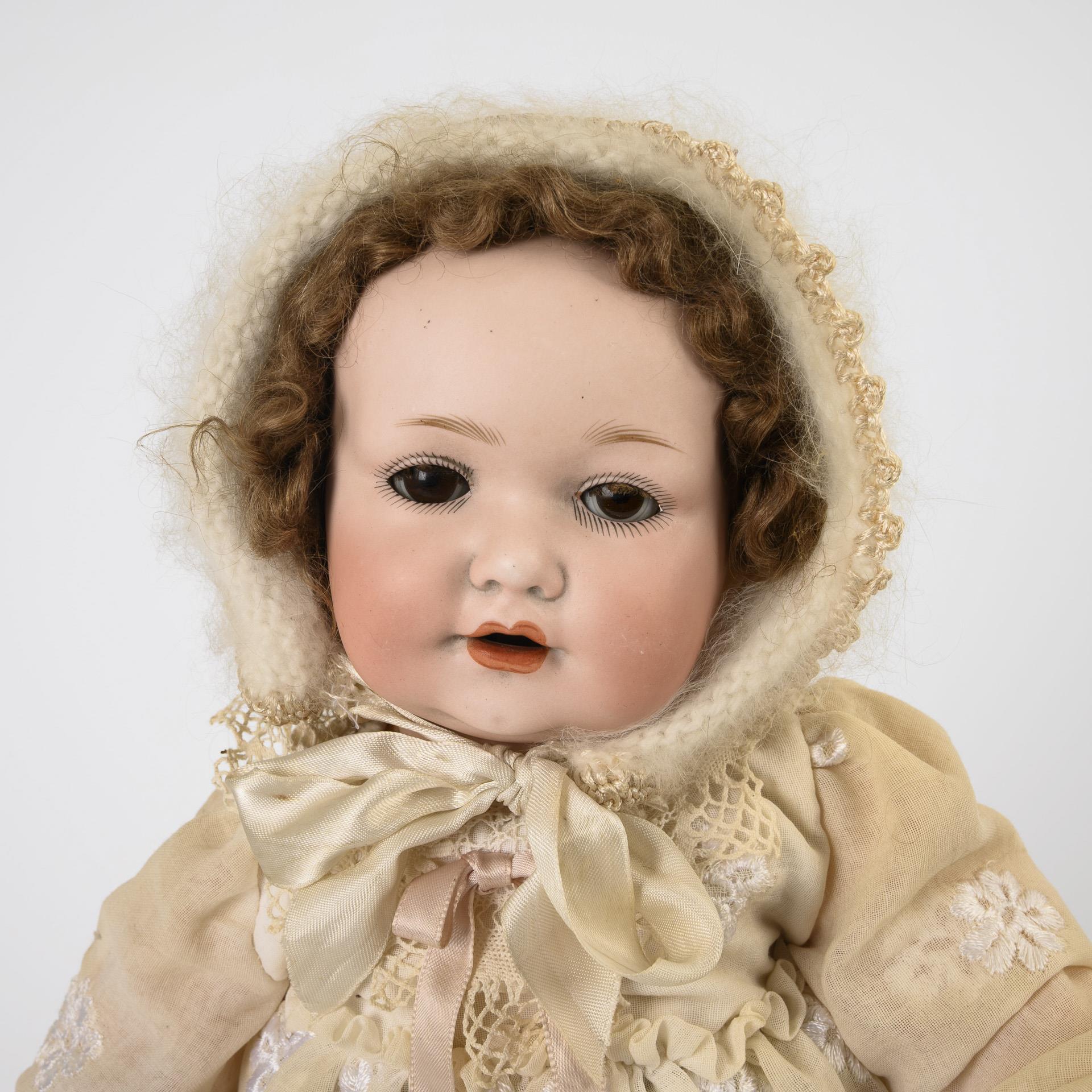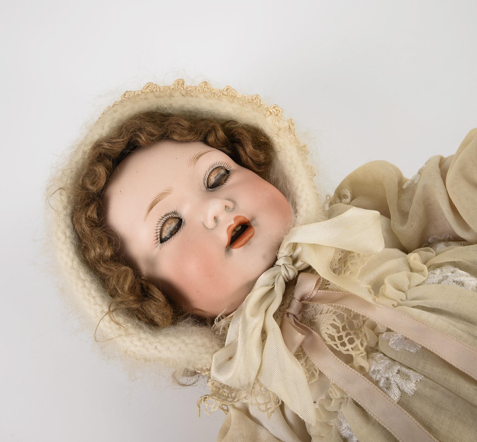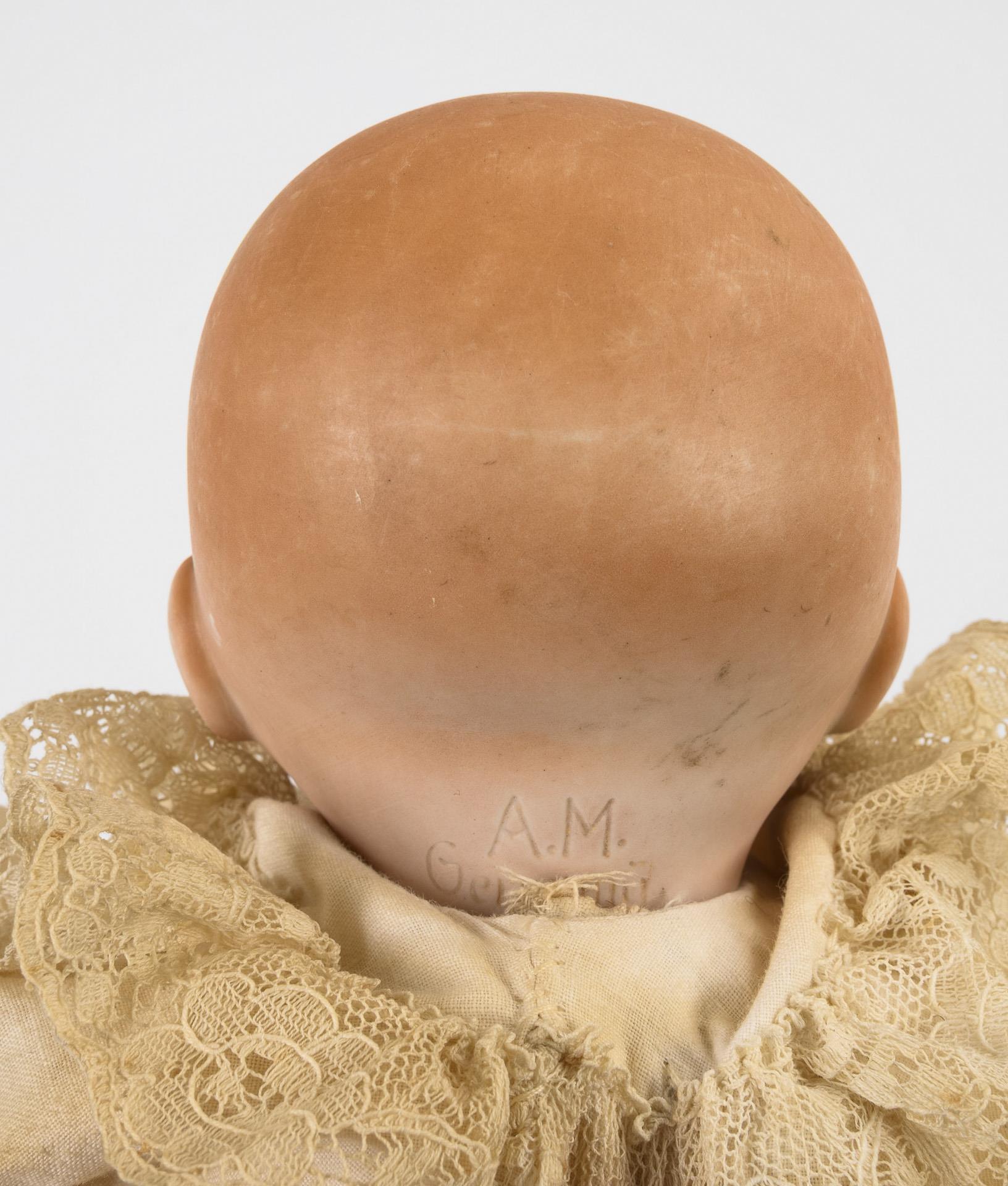 Charakterbaby (AM 971) mit Kurbelkopf, braunen Schlafaugen, gelockter Mohairperücke, 5-teiligem Sitzbabykörper, hellem Kleid und weißer Wollmütze. Kopf mit kleinem Chip an der Kopfkrone, Körper im Nackenbereich repariert, 3 Finger bestoßen. L 46 cm. / Dream-Baby (AM Germany) mit Einbindekopf, blauen Schlafaugen, Stoffkörper und langem hellen Kleid. Beide Augenausschnitte retuschiert. L 38 cm. Beide Körper mit Altersspuren. Kleidung partiell verschmutzt.