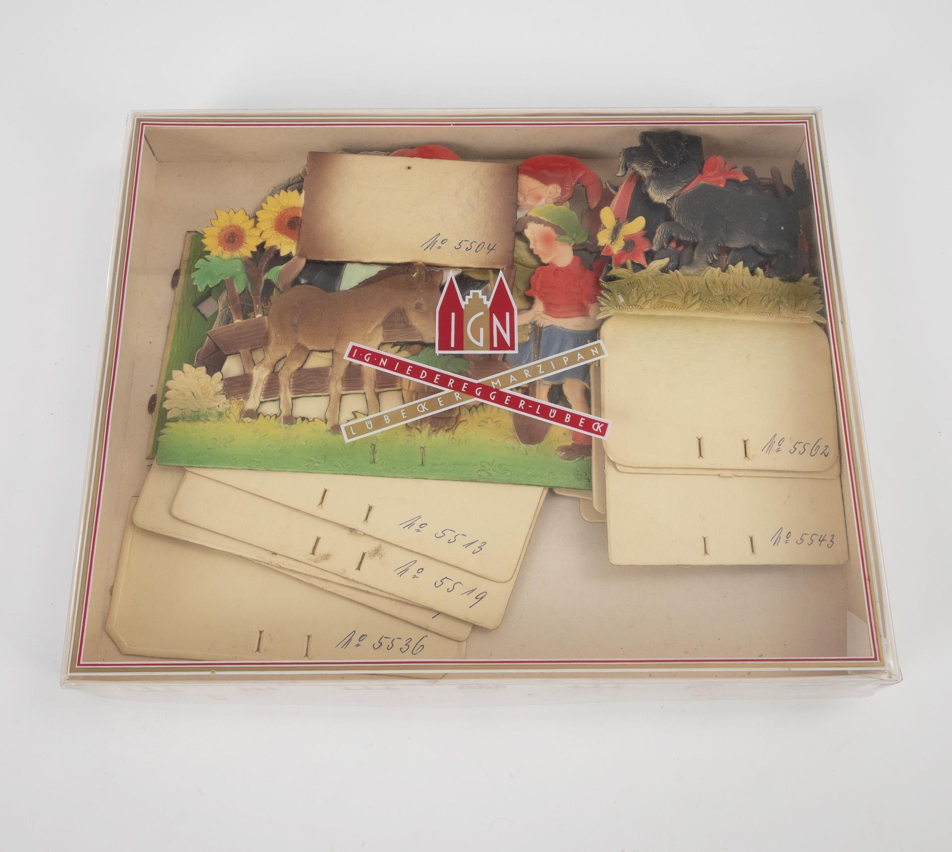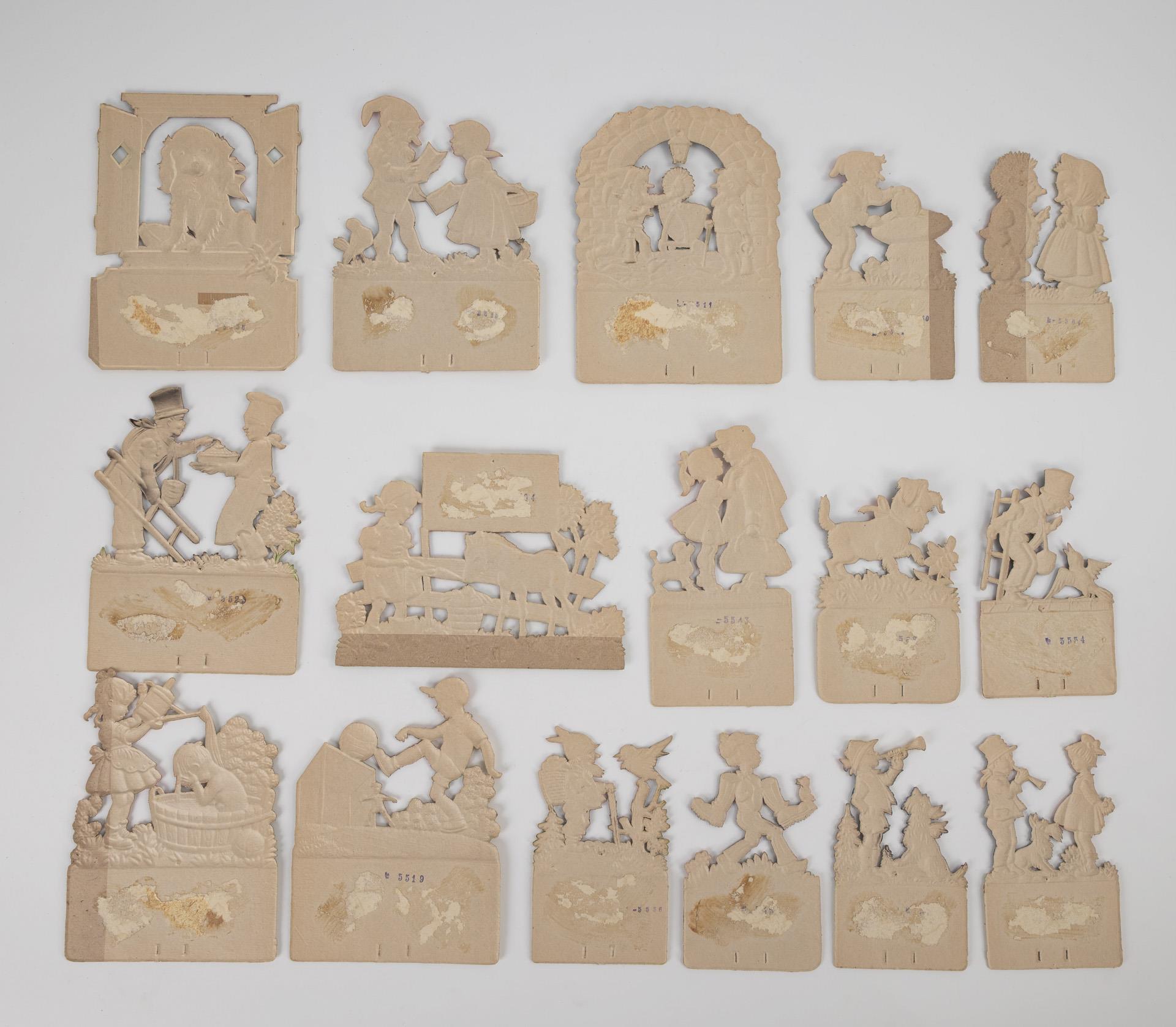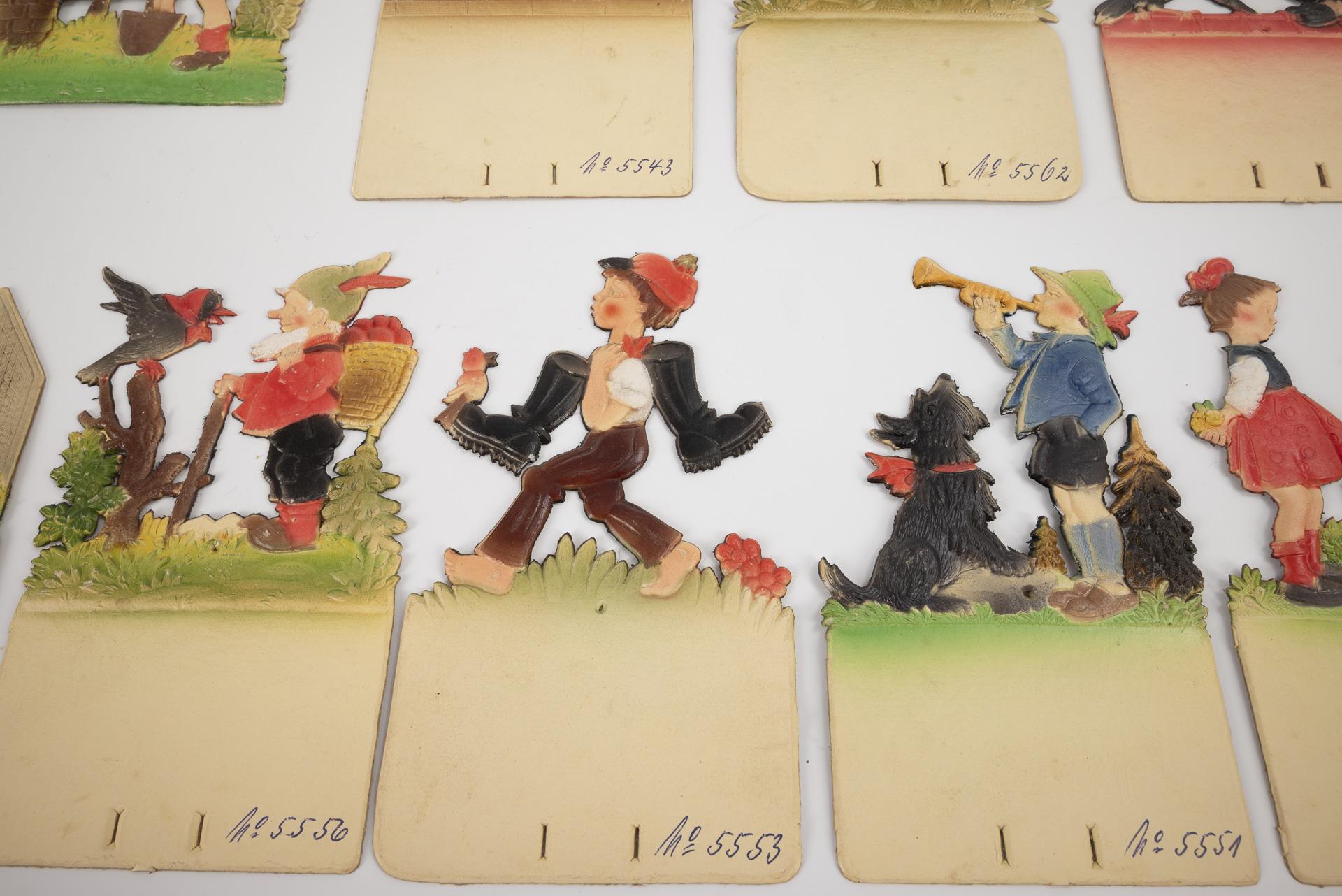 Ca. 16 reliefierte Papp-Aufsteller bzw. Kalenderhalter mit verschiedenen Kinder- und Zwergenmotiven. Mit Kugelschreiber-Ziffern wohl nachträglich beschriftet.