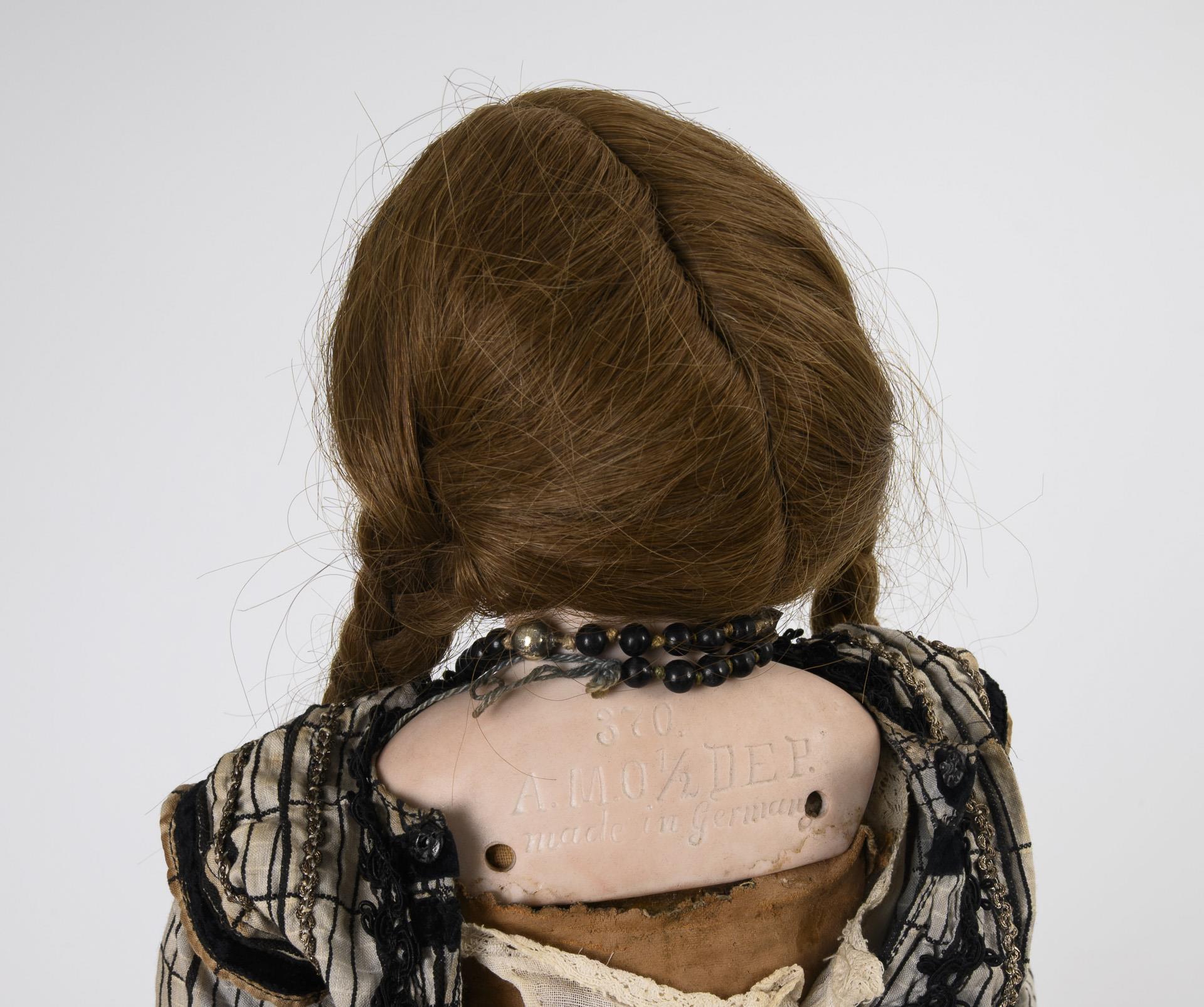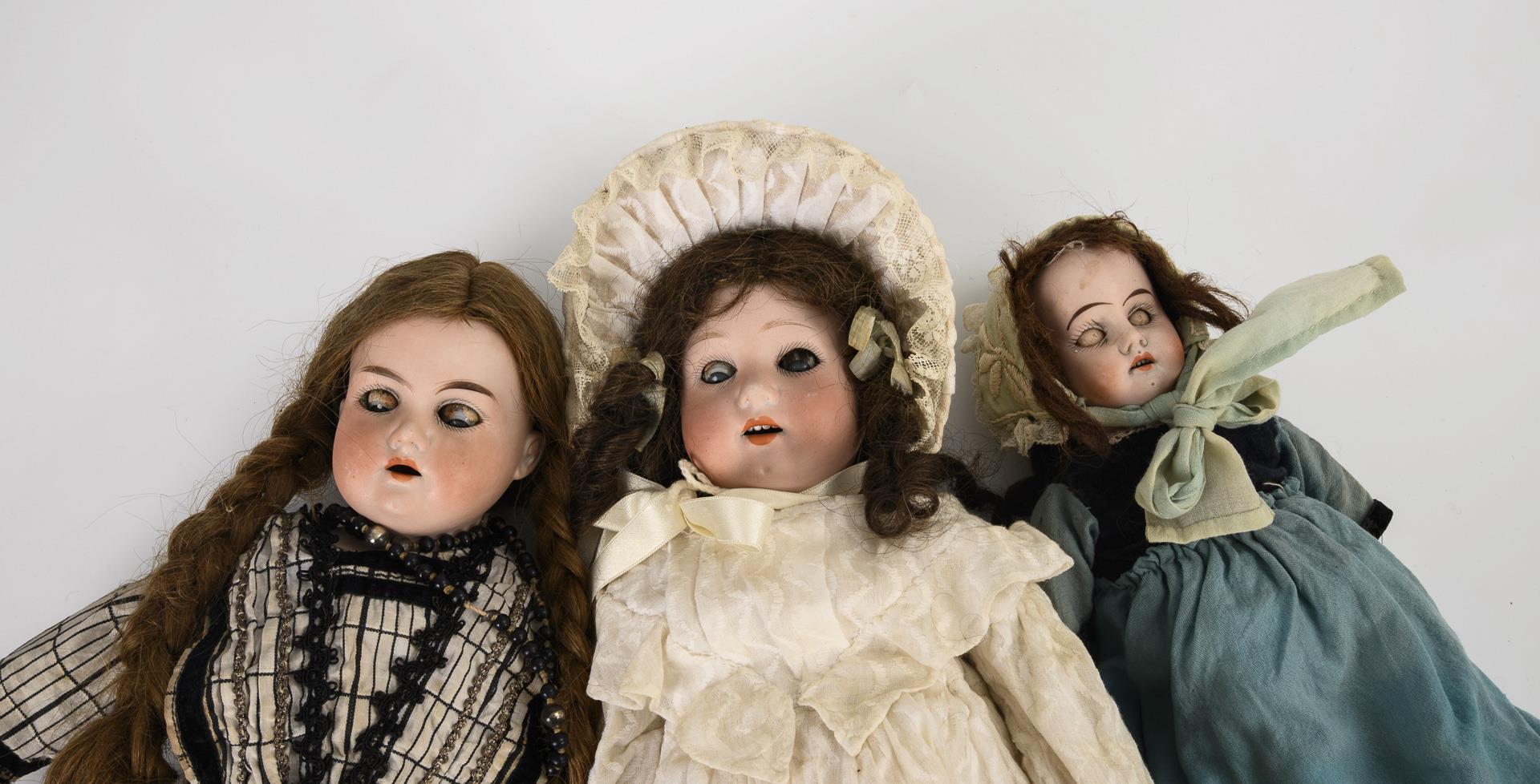 Alle mit Brustköpfen aus Porzellan, blauen Schlafaugen, brauner Perücke, Stoff- bzw. Lederkörper mit Biskuitarmen. 1x Heubach-Köppelsdorf (275) mit weißem Kleid und Strohhut. Finger links bestoßen, L 51 cm. / 1x Armand Marseille (AM 370) mit schwarz-weiß kariertem Kleid. Minimaler Perückenpull, beide Hände etwas bestoßen, L 45 cm. / 1x Ernst Heubach (Hufeisen) mit blauem Kleid und Haube. Linke Hand bestoßen, L 36 cm. Körper jeweils mit Alters- und Reparaturspuren.