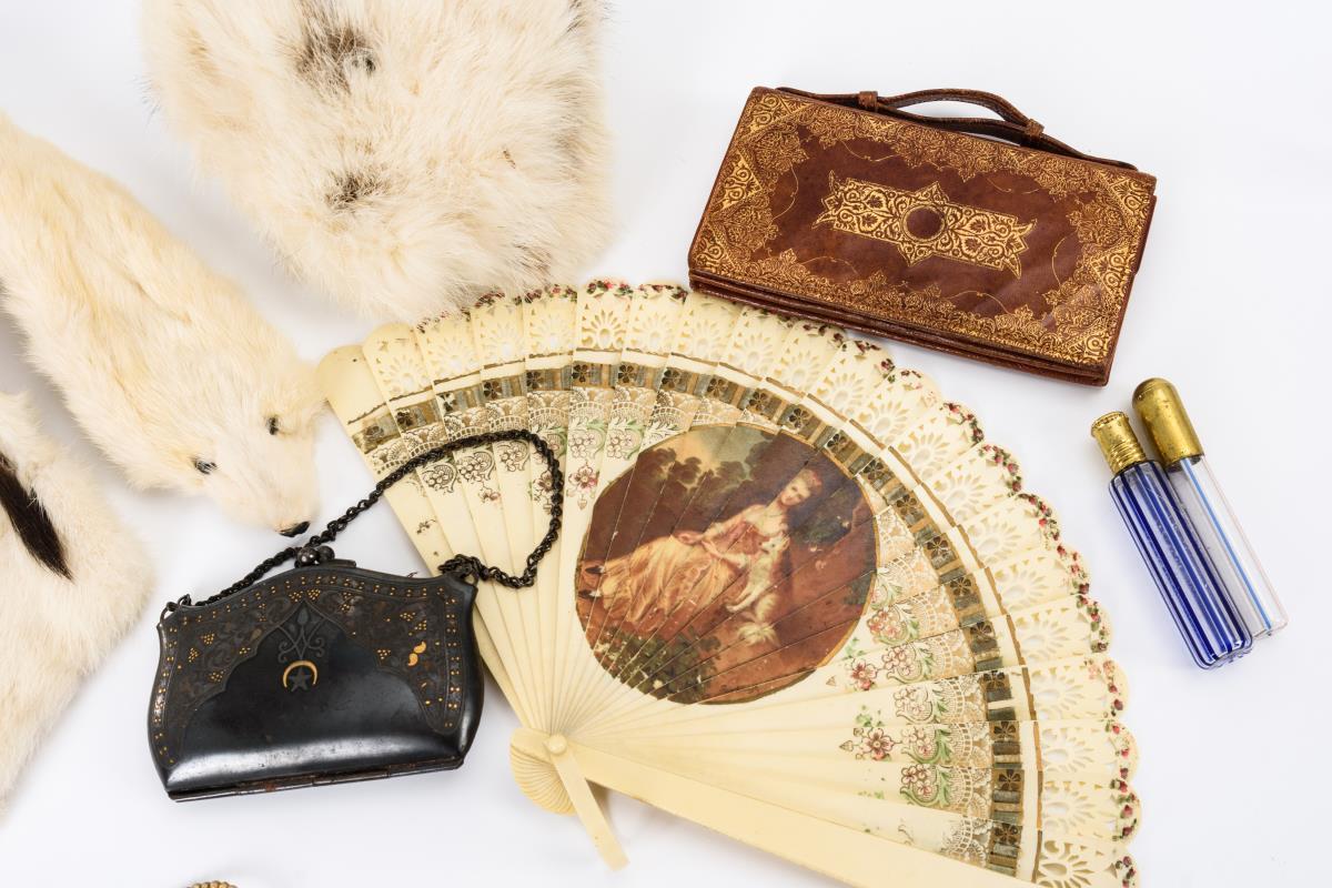 Fellmütze und Nerzkragen, rotbraune Ledertasche mit Goldprägung, Metalltasche mit Goldverzierungen, schwarze Kette, Glasperlenkette, Kunstperlenkette, Fächer sowie 2 Riechfläschchen aus Fadenglas. Teils mit Altersspuren.