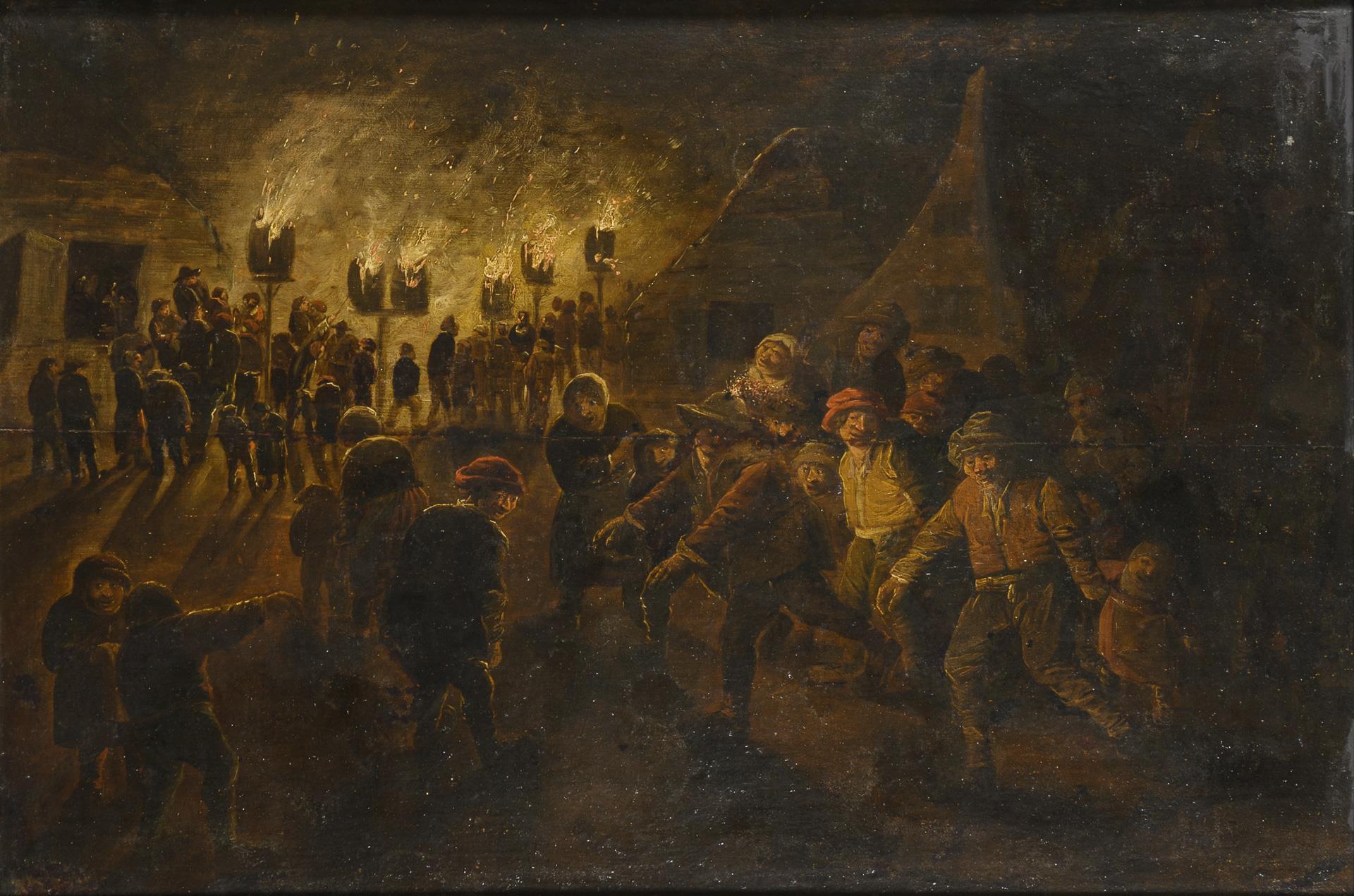 Viele Menschen im Feuerschein in der Nacht auf der Straße zwischen den Dorfhäusern. Restauriert.