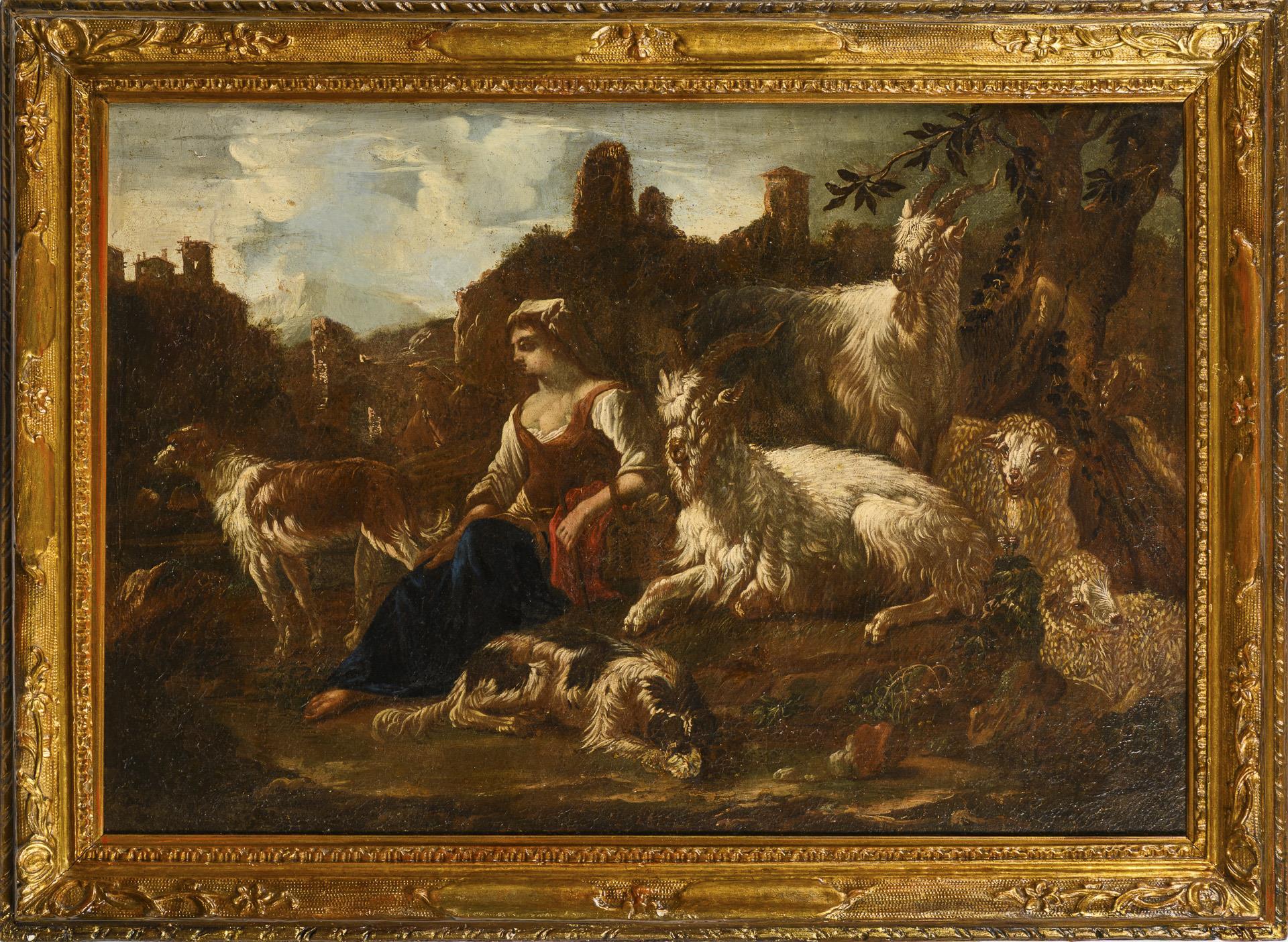 Rastende junge Frau mit einer kleinen Herde aus Ziegen und Schafen im Sonnenschein. Leinwand doubliert.