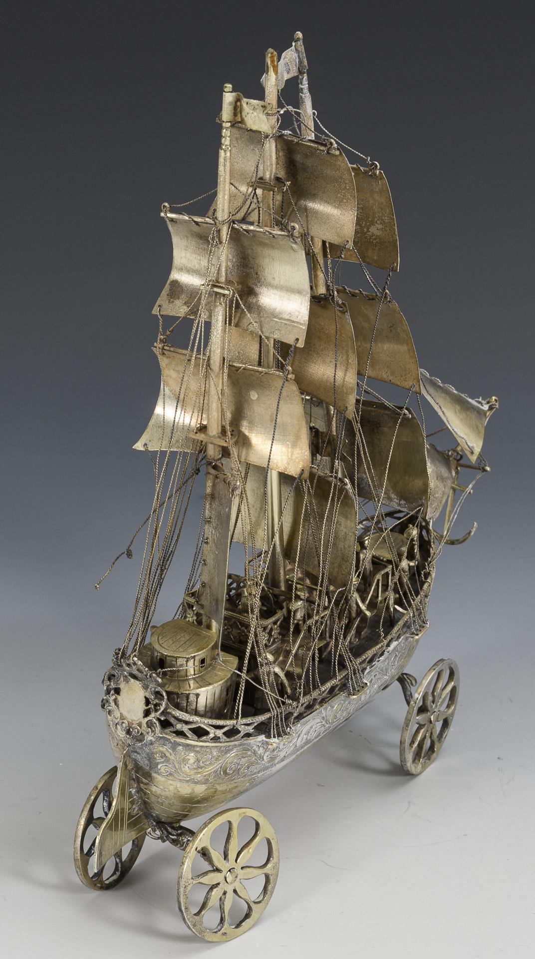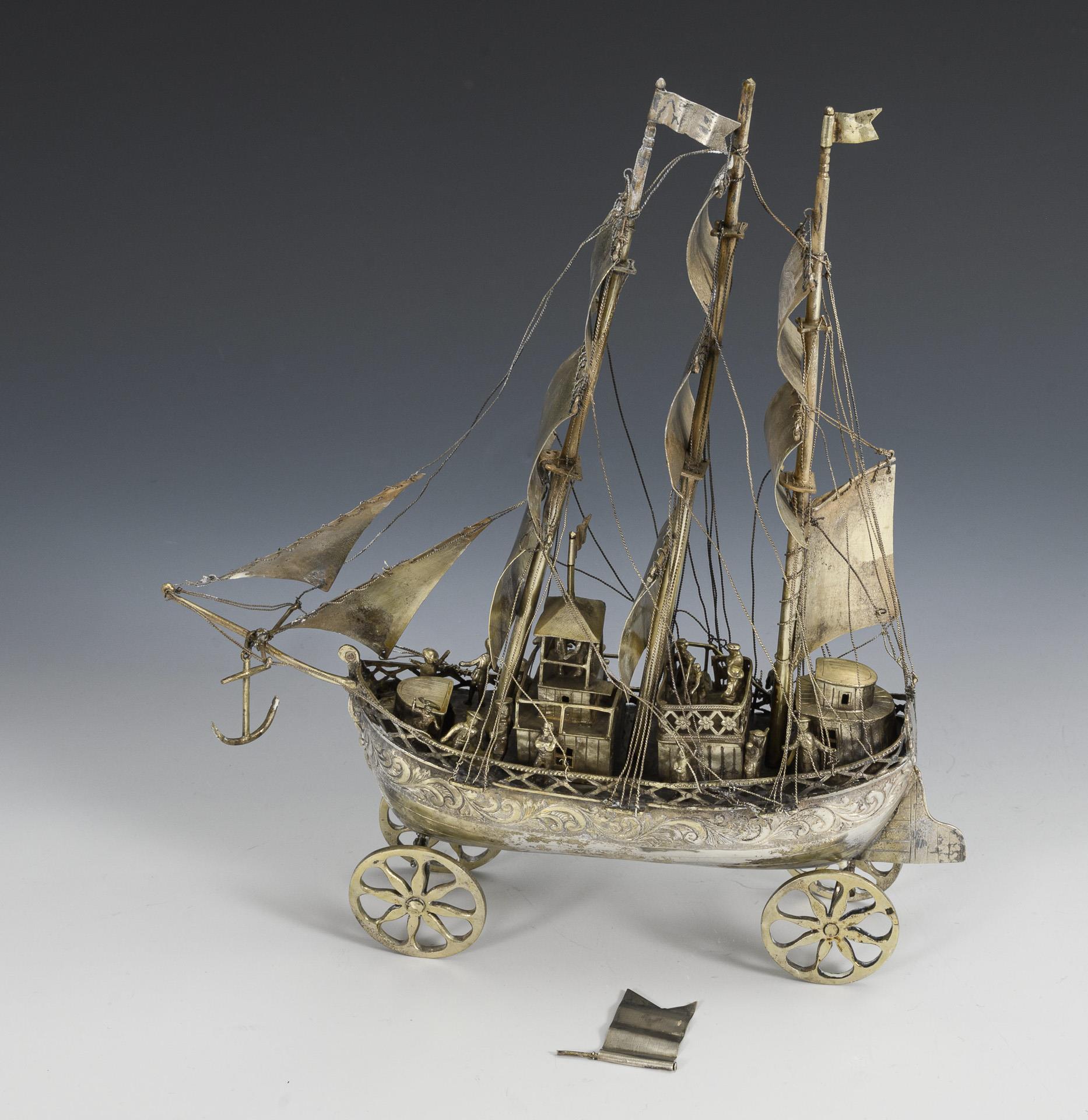 Historisierendes Segelschiff auf 4 Rädern. Leichte Altersspuren, kleine Defekte (Mittelfahne lose anbei).