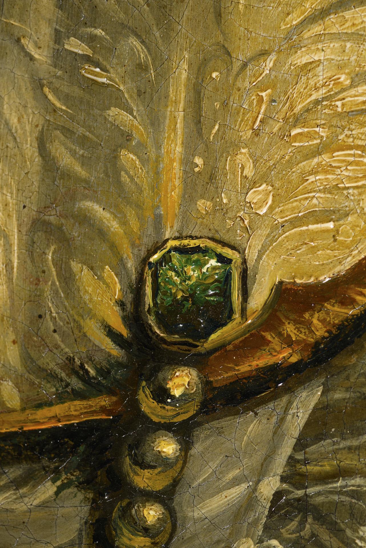 Porträt einer adligen Dame mit blauem Mantel über silberfarbenem Kleid mit Perl- und Goldschmuck. Altersspuren.