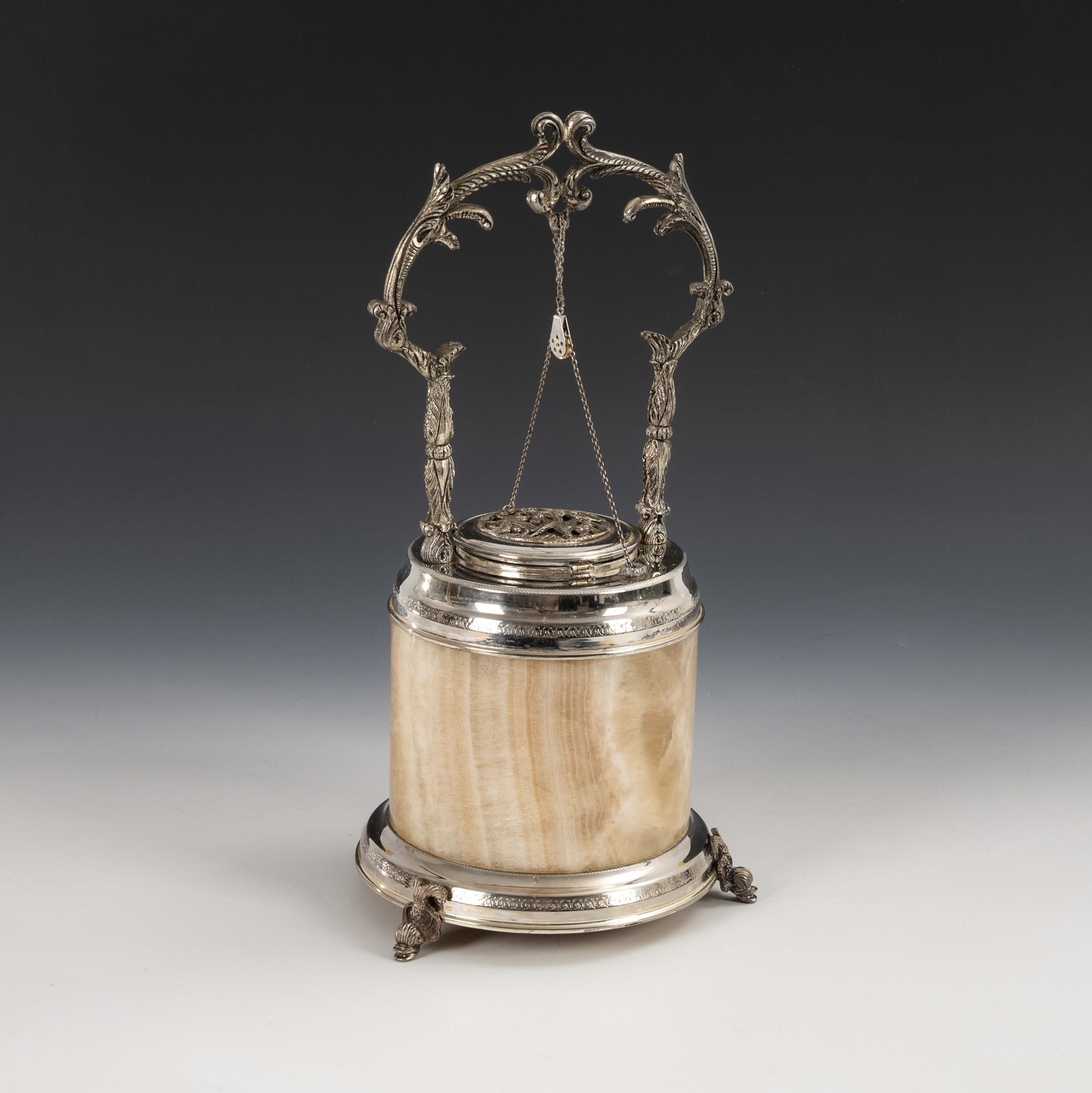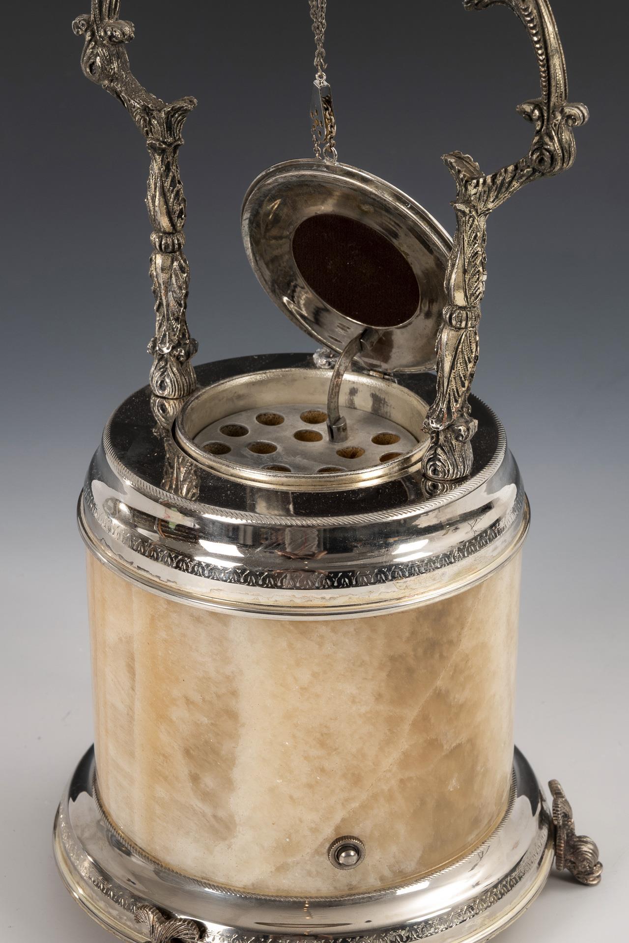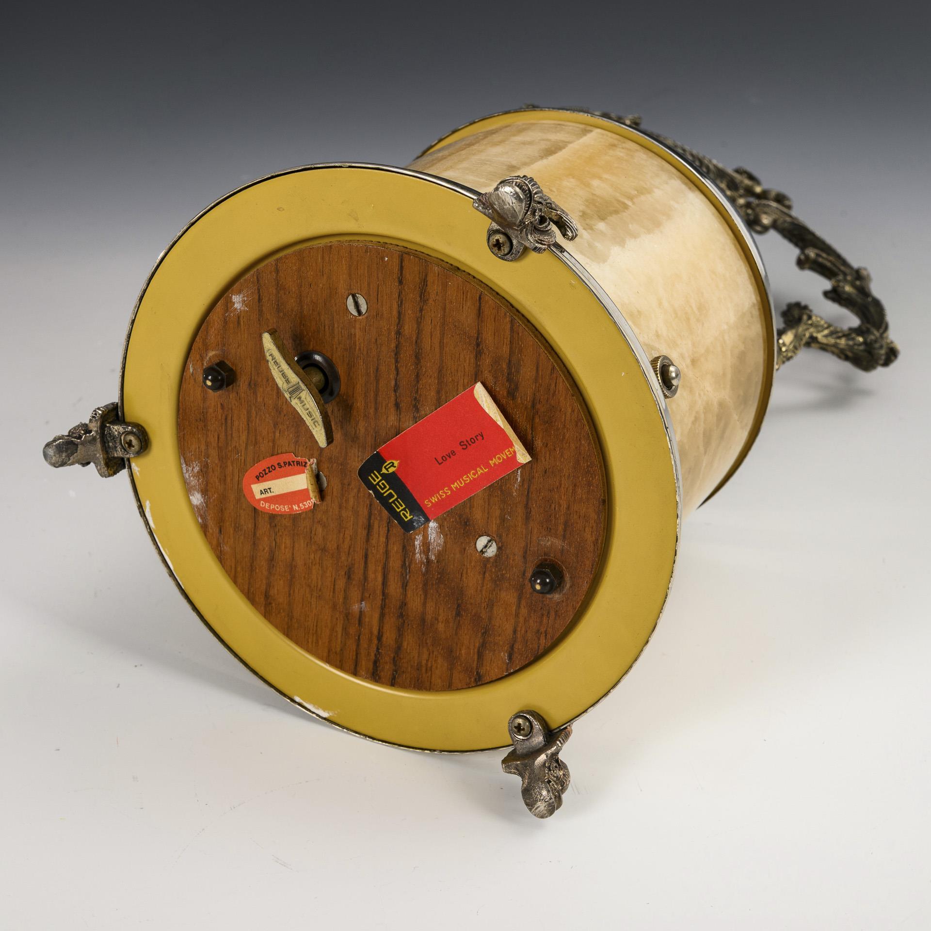 Brunnenförmiger Trommelkorpus aus Stein mit rankenartigem Aufbau für die Zugkette zum Scharnierdeckel mit Vogelrelief. Das Betätigen des seitlichen Knopfes setzt das Spielwerk mit der Melodie "Lovestory" in Gang, wobei gleichzeitig der Deckel mit dem darunter liegenden Zigarettenhalter gehoben wird. Minimal berieben.