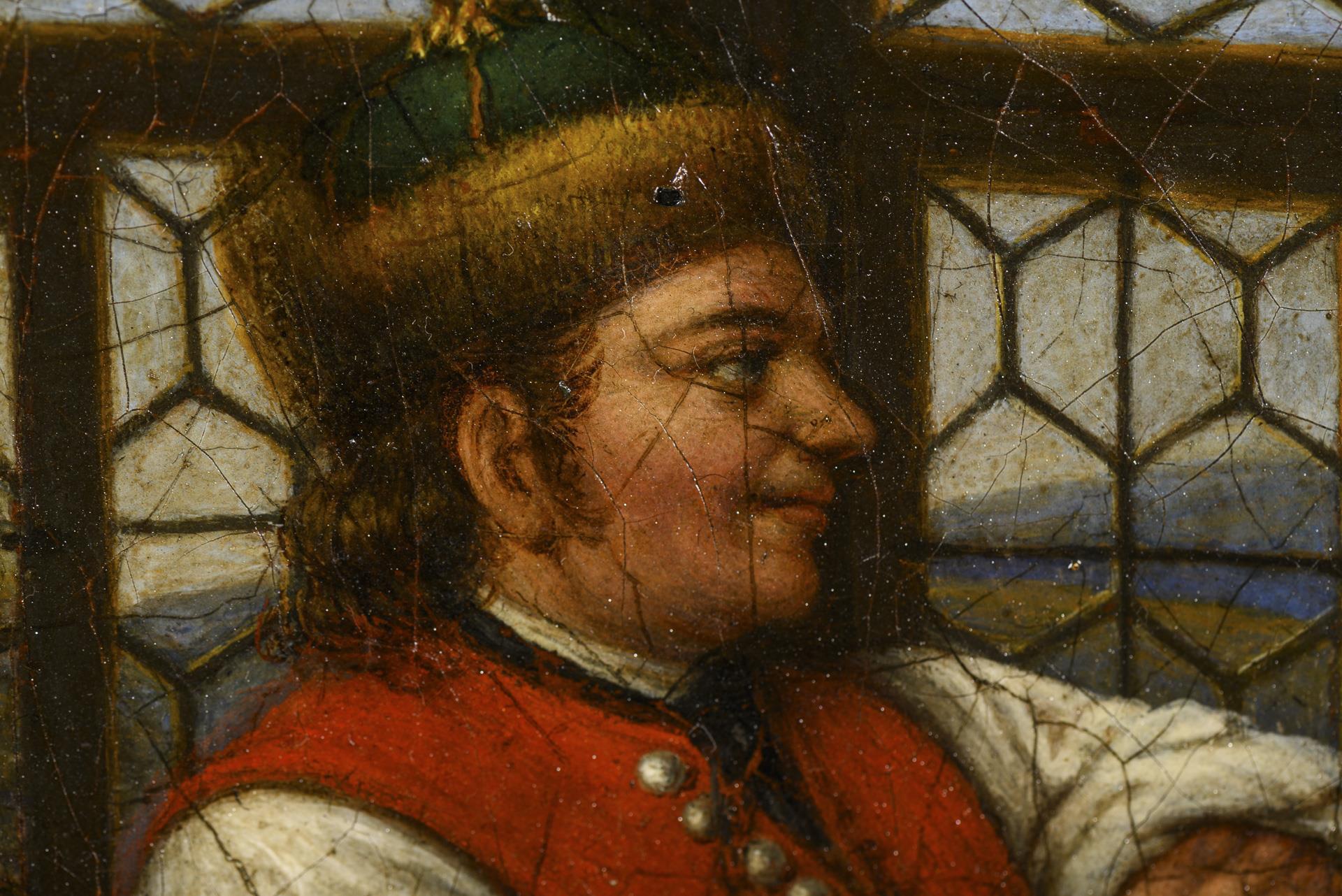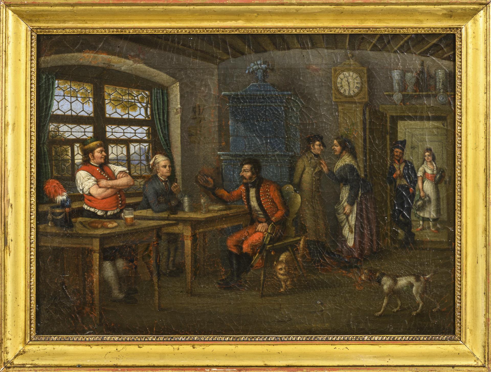 Darstellung eines Wirtshaus-Interieurs mit mehreren Figuren. Restauriert mit zwei Hinterklebungen.