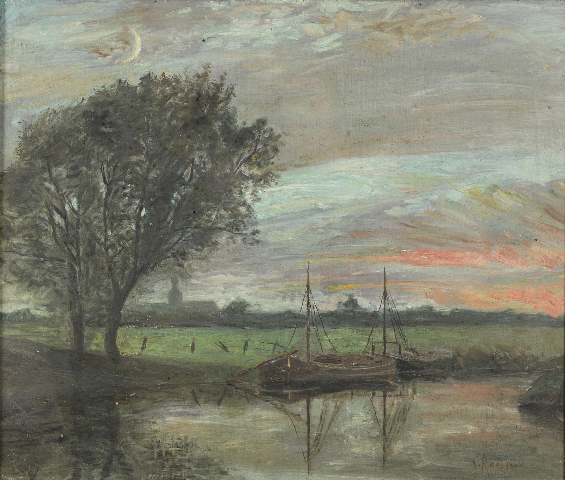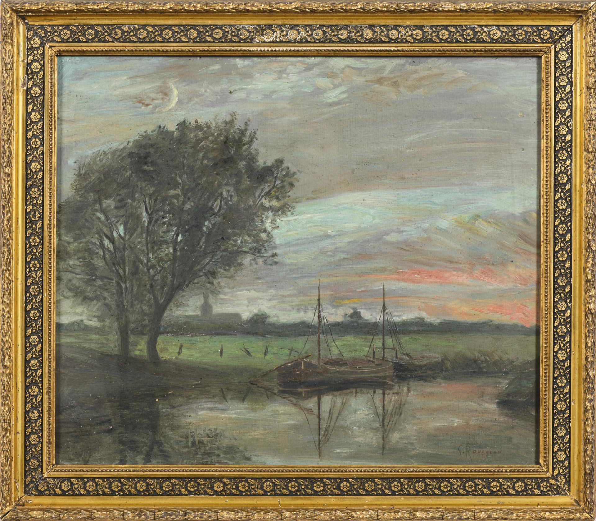 Darstellung zweier Schiffe auf einem Fluss bei Sonnenuntergang. Leichte Altersspuren.