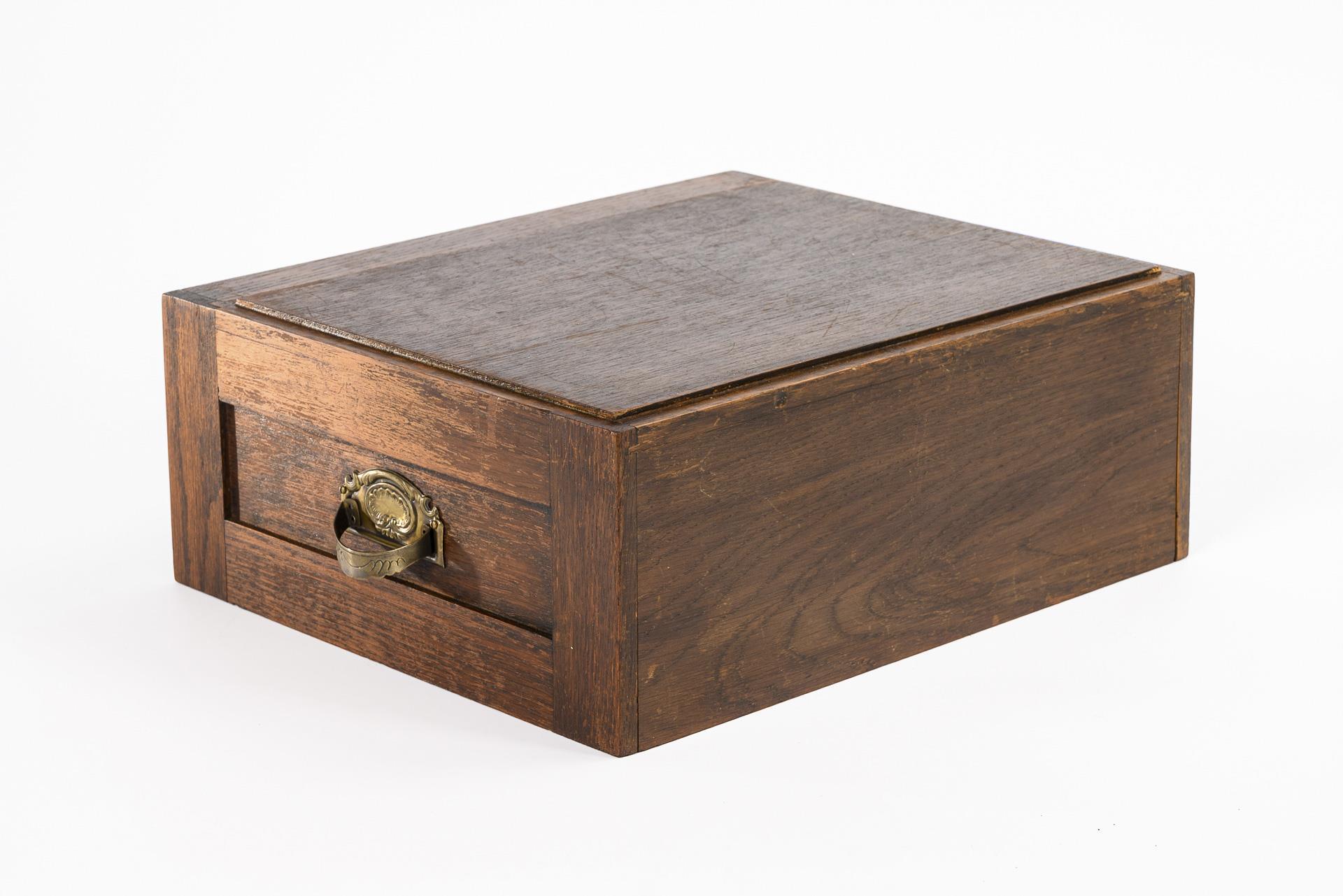 Eiche massiv, dunkel gebeizt, Schübe mit schwarzem Leder, Messingbeschläge. 14 x 36 x 30 cm. 4,6 kg.