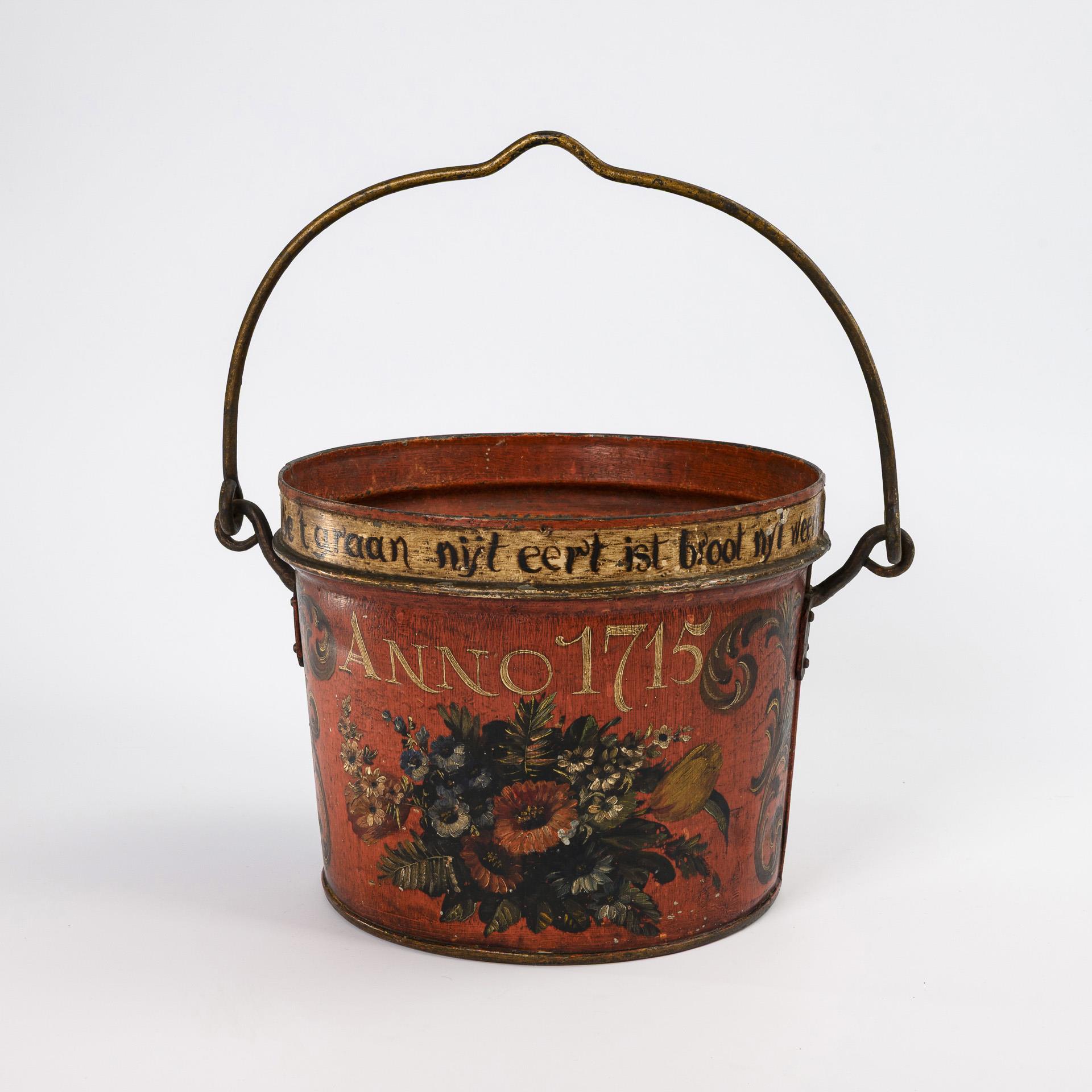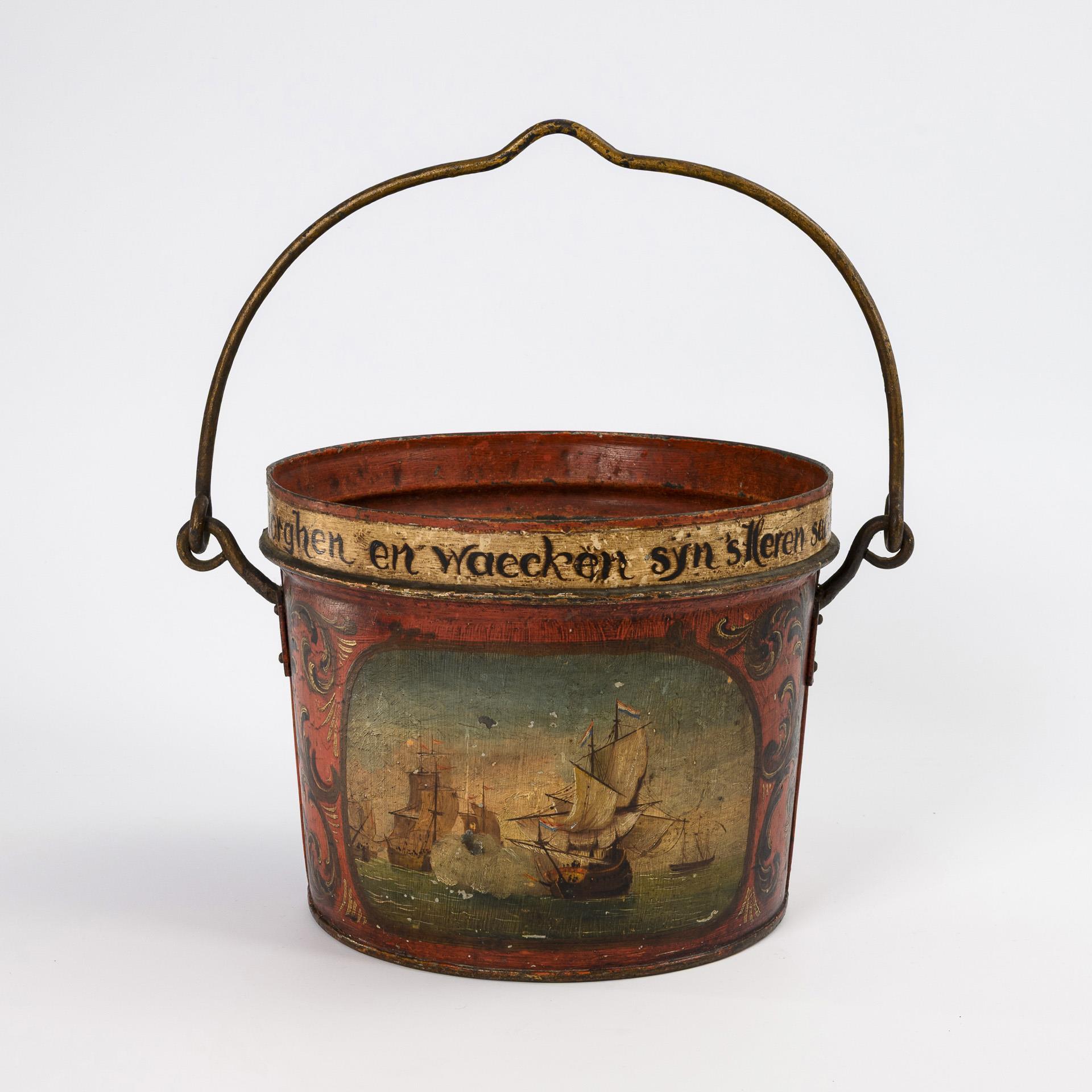 Leicht konischer Eimer mit Wulstsicke unterhalb der Lippe sowie angenietete Attaschen für den Tragehenkel. Der Korpus ist aus 2 Hälften mit Nahtfalzen gearbeitet; ebenso ist der glatte Boden eingefalzt. Auf der Wandung mit rotem Grund und Akanthusblätten ovales Gemälde einer Seeschlacht zwischen einem niederländischen Schiff und der spanischen Flotte. Auf der entgegengesetzten Seite Blumenbukett mit Jahreszahl "Anno 1715". Unterhalb der Lippe niederländischer Schriftzug "Sorghen en waecken syn 'sHeren saecken. Die 't graan nyt eert ist broot nyt weert". Kleine Beulen und Farbabplatzer, innen etwas rostig.