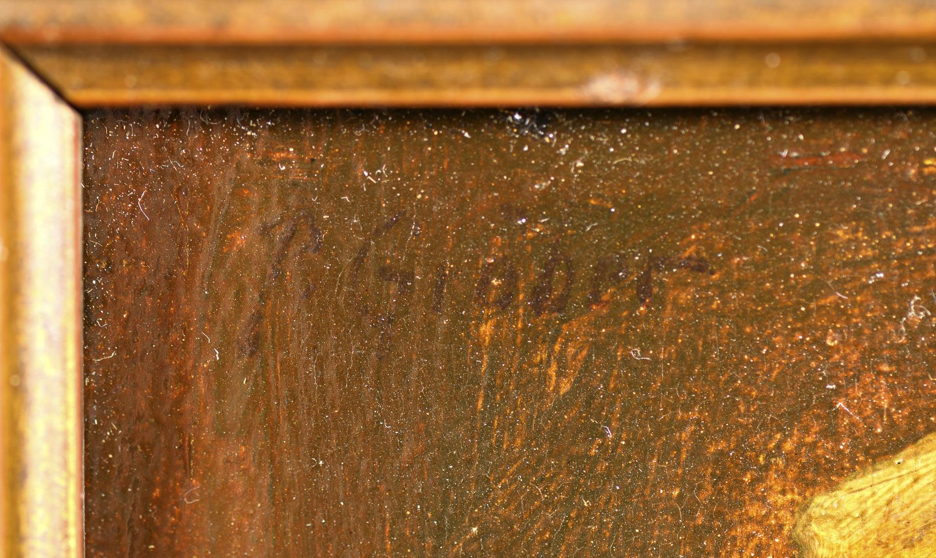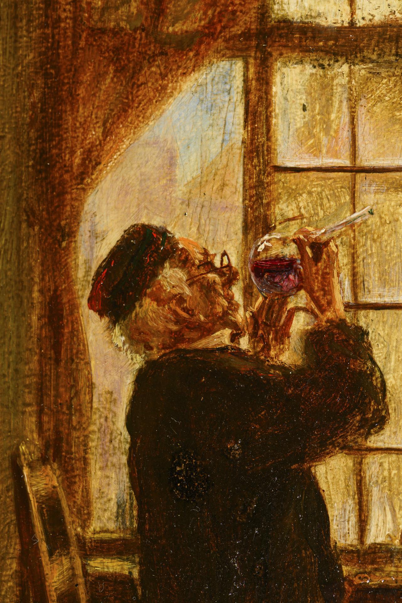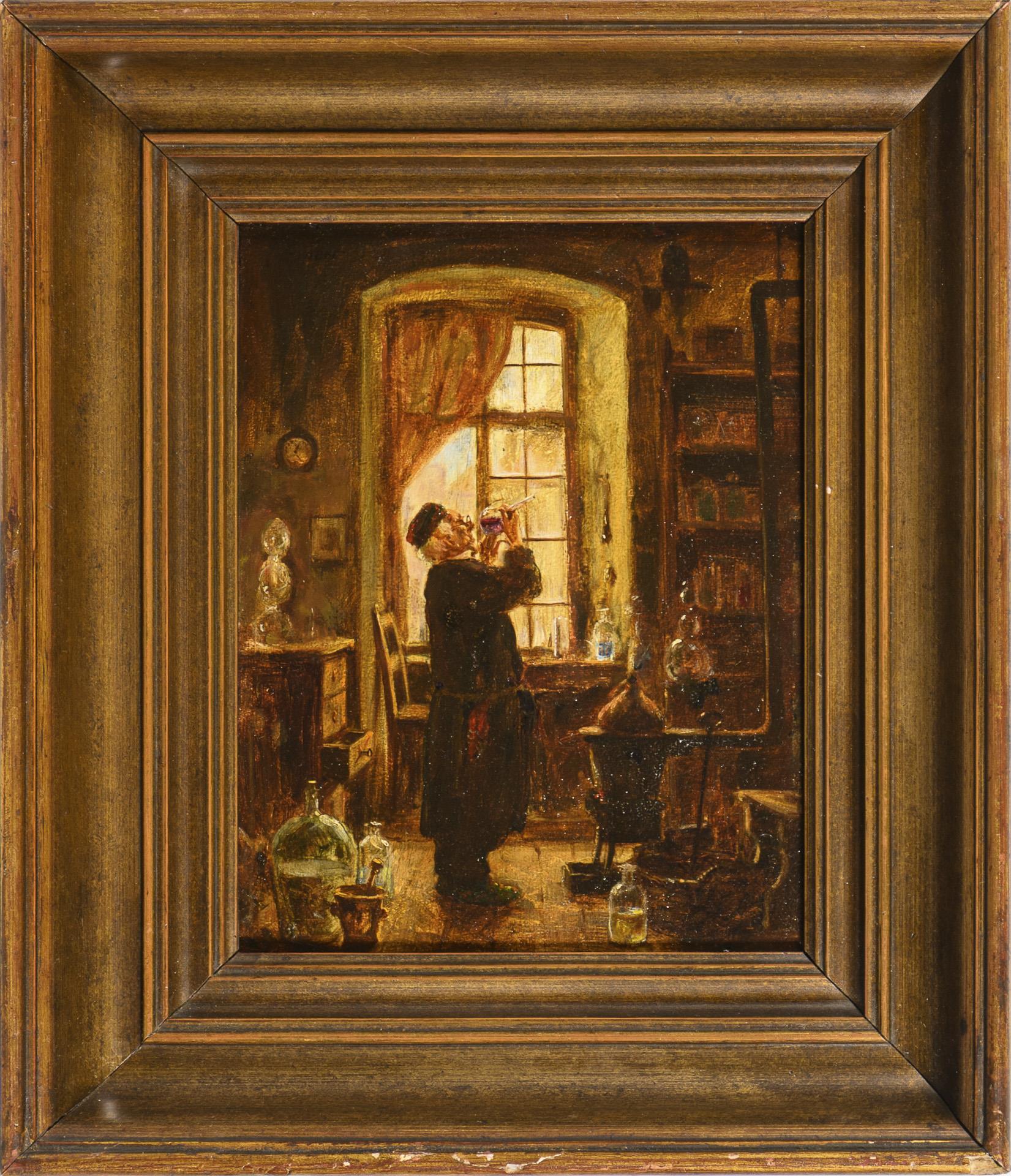 In der Manier Spitzwegs gemaltes Interieur mit altem Gelehrtem beim Beschauen einer violetten Flüssigkeit. Leichte Altersspuren.