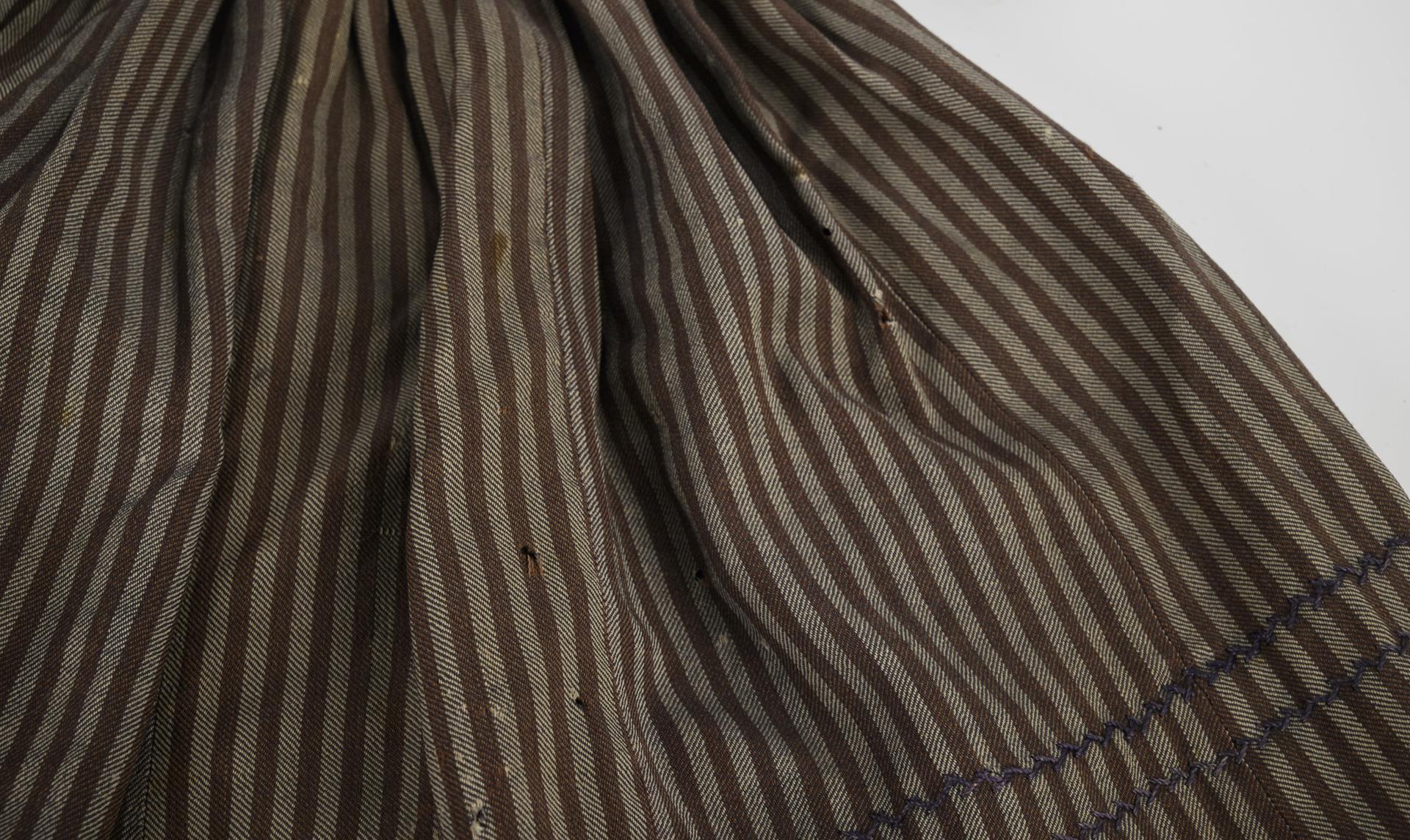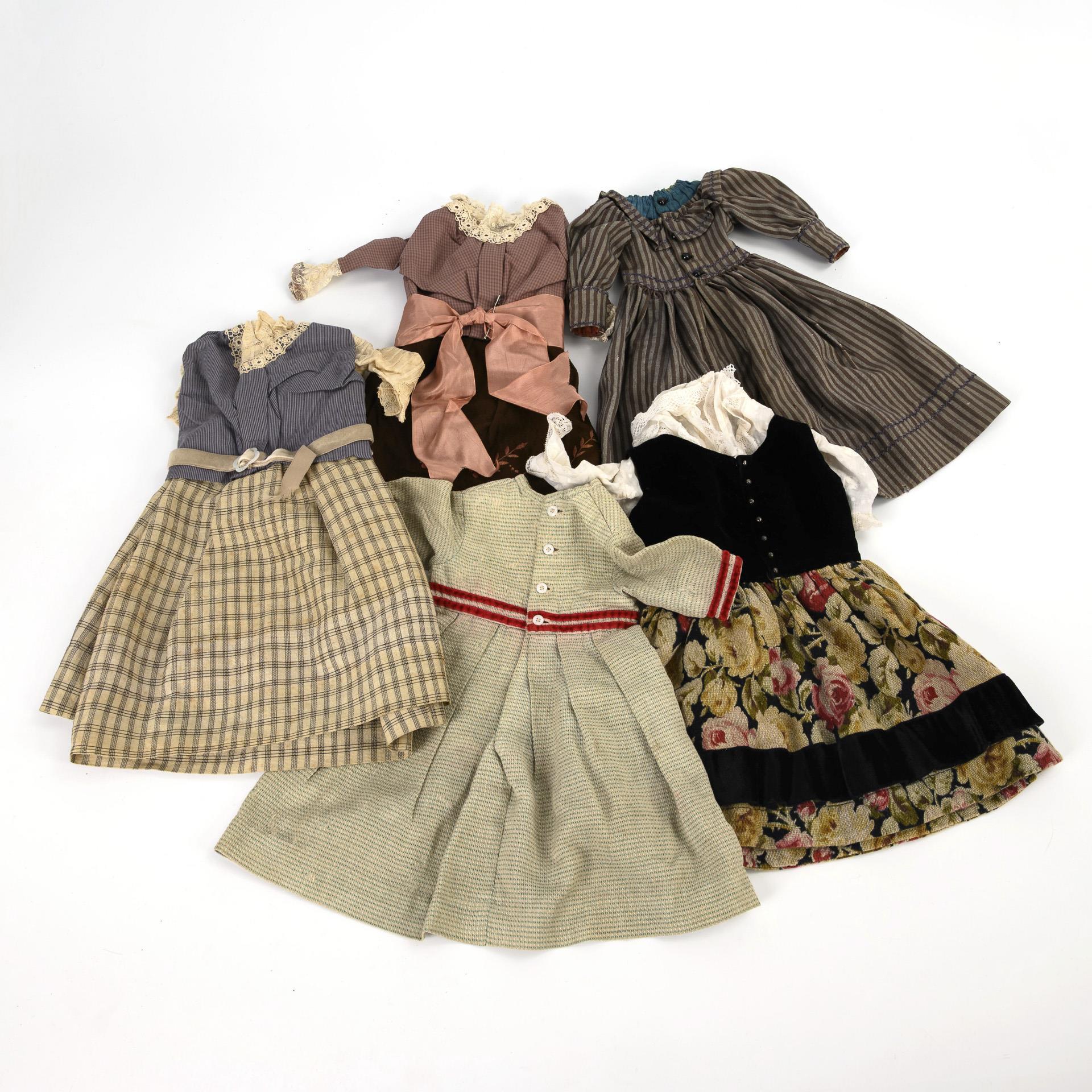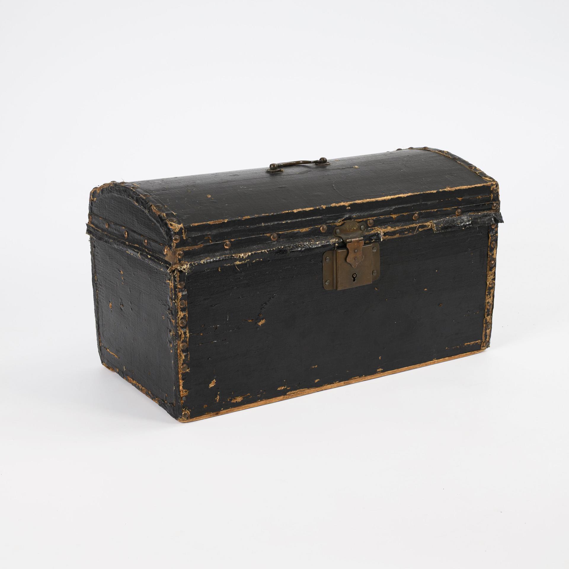Schwarzer Holzkoffer mit gewölbtem Deckel und Schloss. Ohne Schlüssel. Dazu Konvolut schöne Kleider (meist alt oder aus alten Stoffen gefertigt). Teils starke Altersspuren, kleine Defekte.