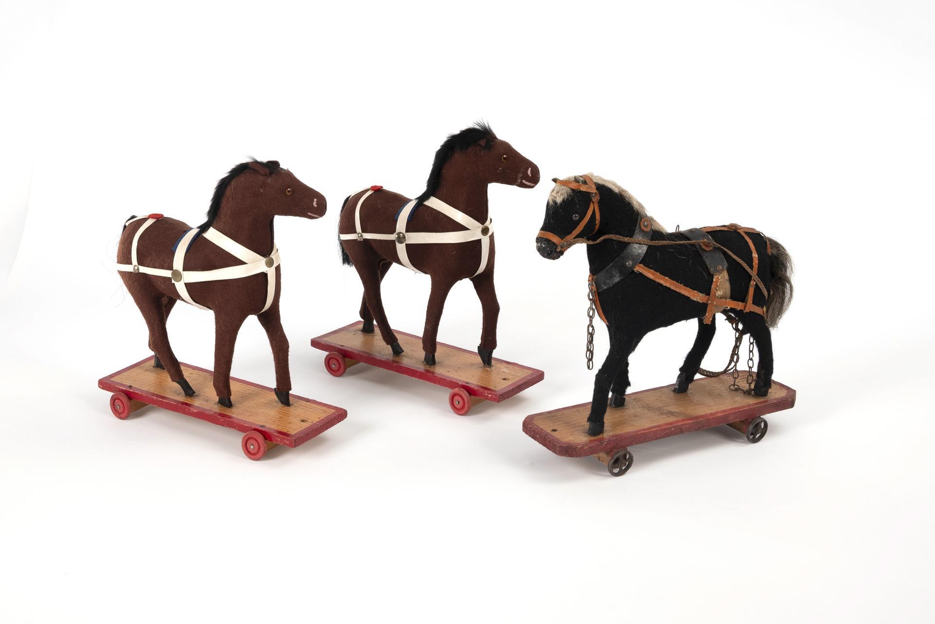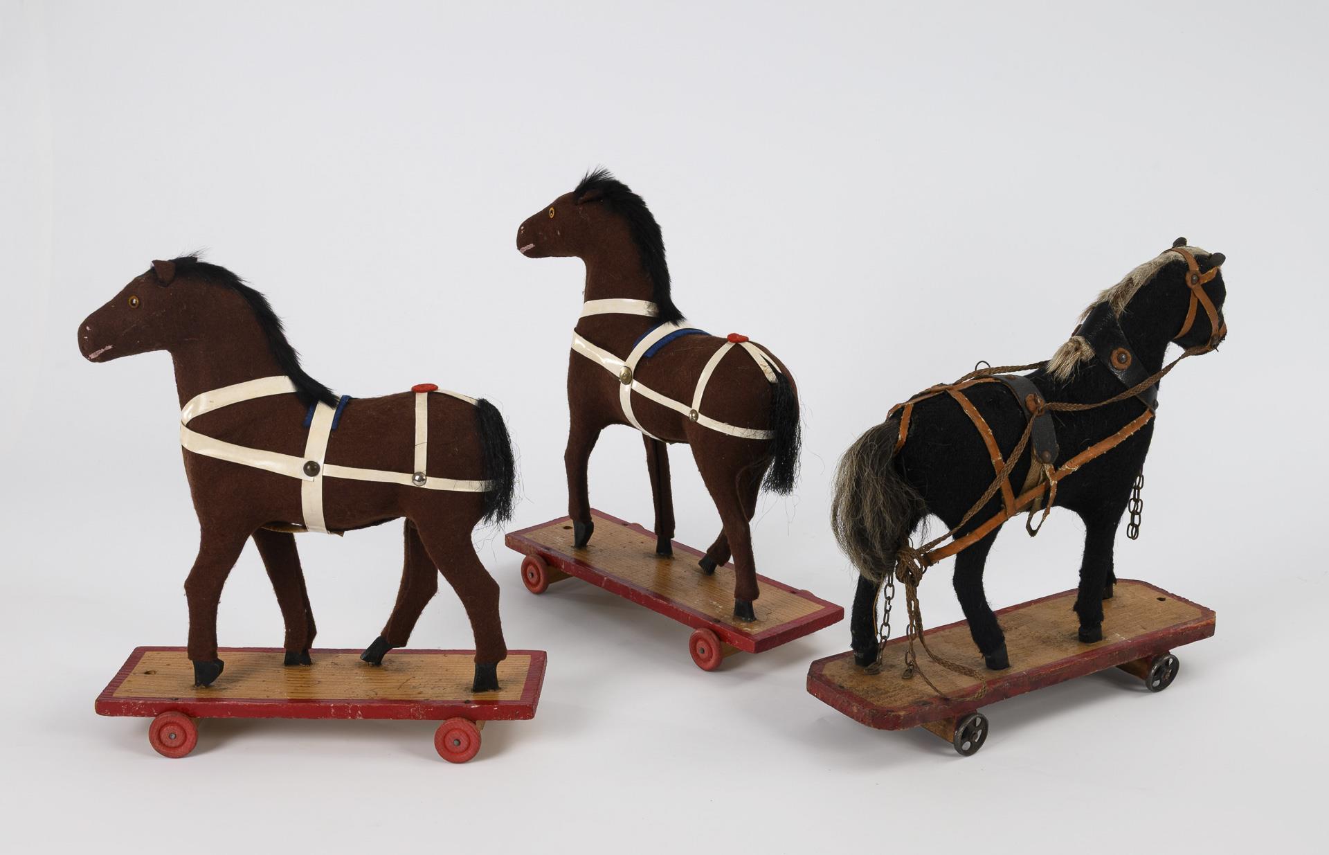 1 schwarzes, älteres Pferd mit Zaumzeug aus Wachstuch, auf Räderplatte mit Metallrädern (L 26,5 cm). 2 braune Pferde mit weißem Kunststoff-Zaumzeug, auf Räderplatte mit roten Metallrädern (L je 24 cm). Altersspuren, kleine Defekte.