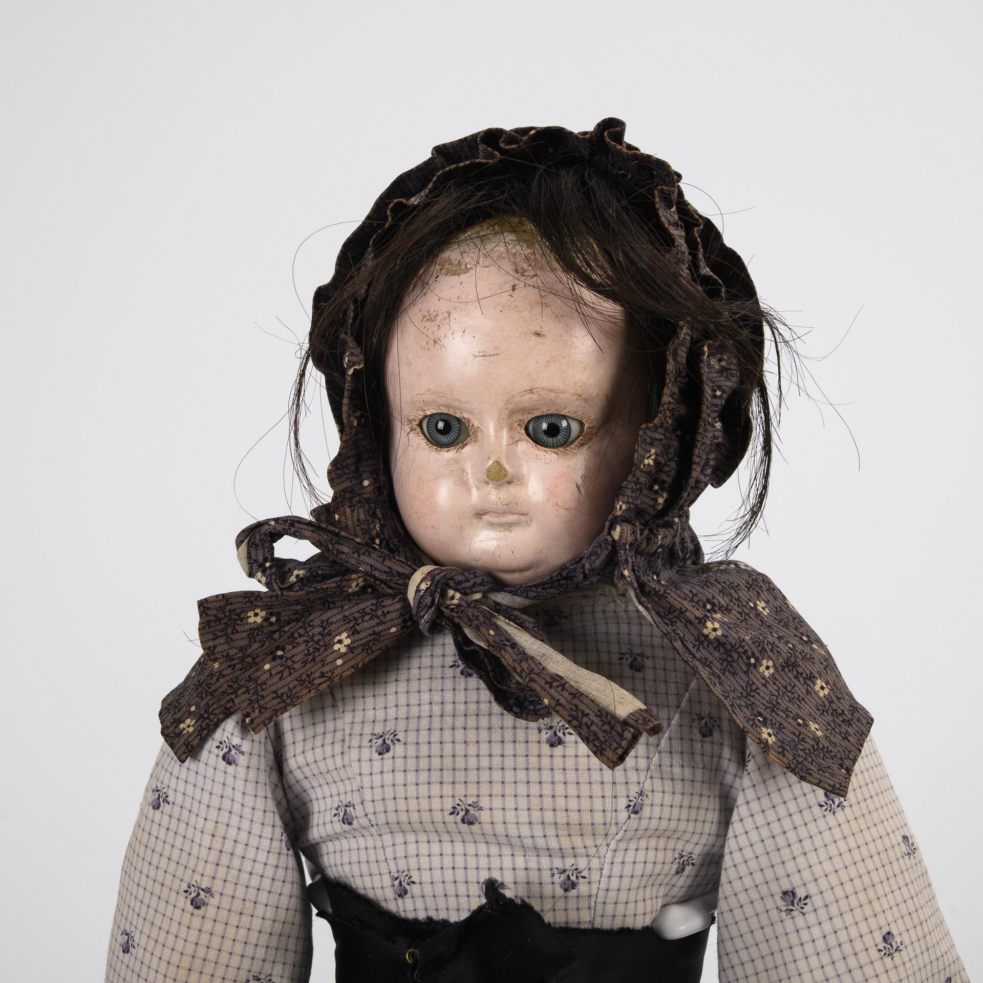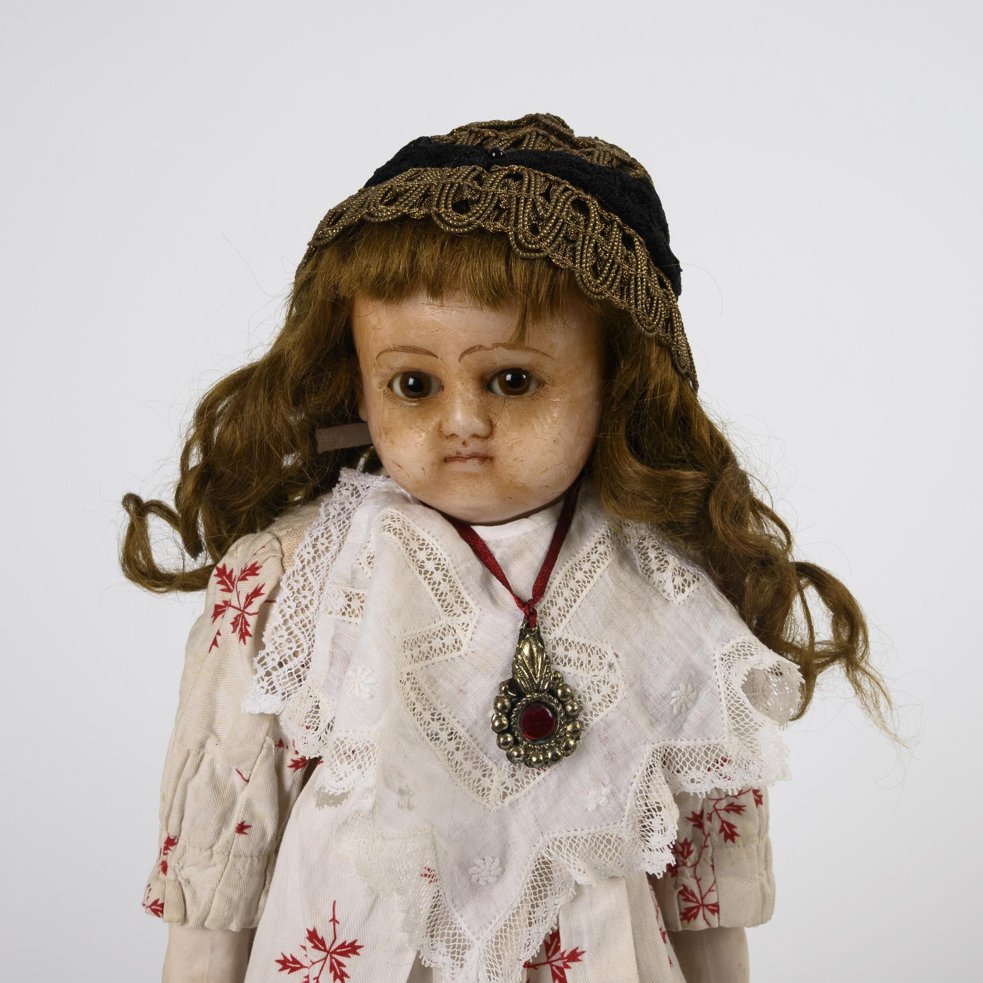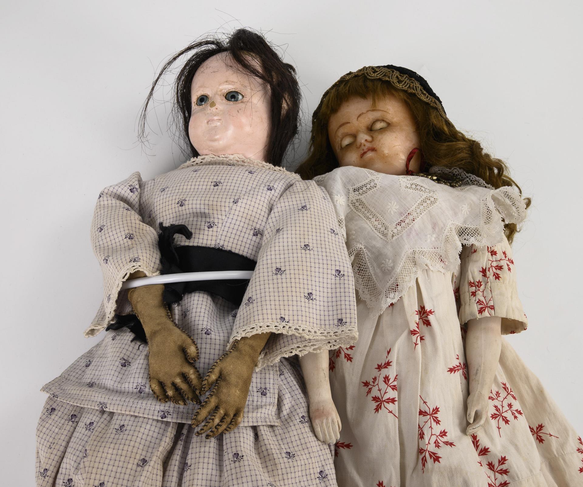 Wachskopf-Puppe mit braunen Schlafaugen, geschlossenem Mund, brauner Mohairperücke, Stoffkörper, Biskuitarmen und weißem Kleid mit rotem Muster. Feine Risse im Gesicht. L 48 cm. / Pappmaché-Puppe mit festen blauen Augen, geschlossenem Mund, braunen Echthaaren, Stoffkörper, ergänzten Lederarmen und hellem Kleid mit violettem Druck. Nasenspitze bestoßen. L 52 cm. Beide mit Altersspuren.