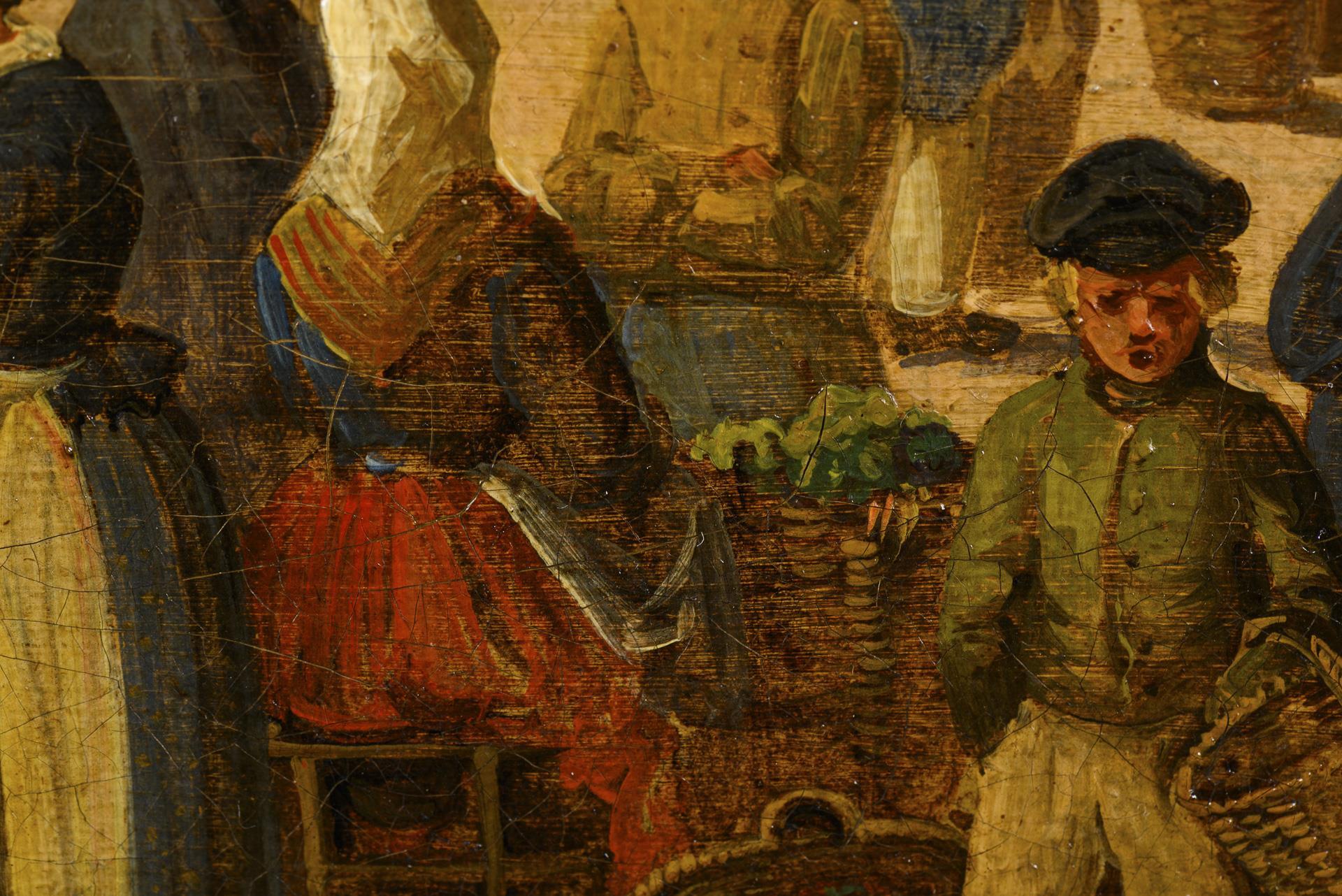 Stimmungsvolle Ansicht des detailliert gemalten Gebäudes auf dem belebten Platz mit vielen Personen im Sonnenschein. Ein Kratzer.