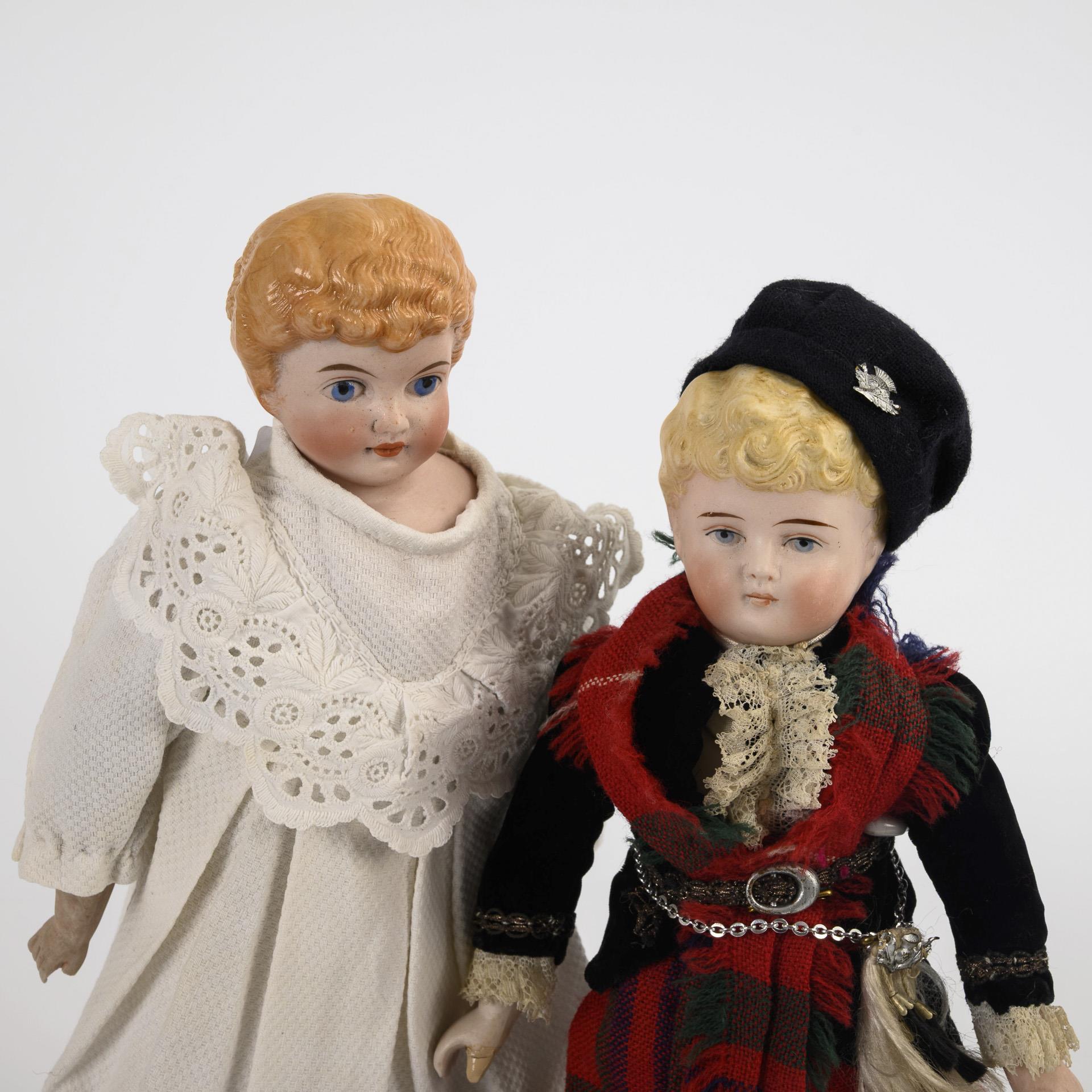 Beide mit gemalten blauen Augen und blonden Haaren. 1x Kling (Germany 186) mit Lederkörper, Biskuitarmen und weißem Kleid. L 34 cm. / 1x Alt, Beck & Gottschalck (1222) mit Stoffkörper, Biskuitgliedern, modellierten Schuhen und Schottenkleidung. L 31 cm. Köpfe ohne sichtbare Defekte, beide mit Defekten und Reparaturen an Armen und Körper.