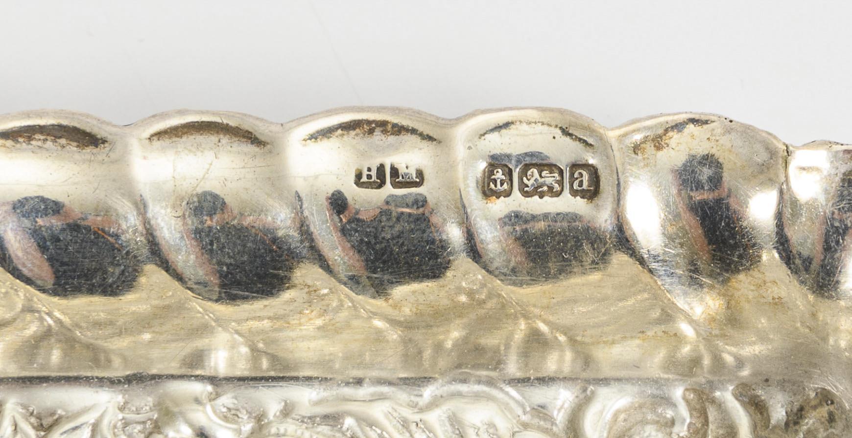 Schmales, reich reliefiertes Tablett (H. Matthews, Birmingham 1900). 22 x 7,5 cm. / Dazu 6 Vorlegeteile mit Rosenrelief: Tortenheber, 2 Zuckerzangen, 2 Löffel und 1 Aufschnittgabel (Alle deutsch, 800/835 gepunzt). Tablett mit winzigen Randrissen.
