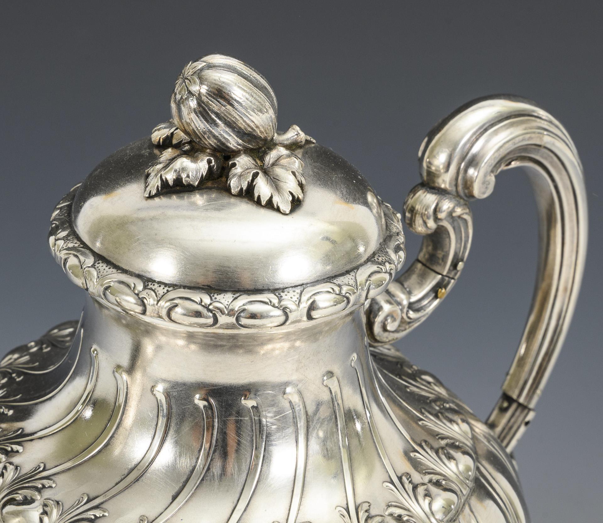 Bauchige, im Schulterbereich godronierte Historismus-Kanne mit floralem Reliefdekor, Rocaille-Henkel und 4 Blattfüßchen, Scharnierdeckel mit Fruchtknauf. Wandung mit ligierter Monogrammgravur, am Boden graviert "Maria Josefa Antonia 7. Juli 1896". Wandung gedellt, partiell leichte Kratzspuren.