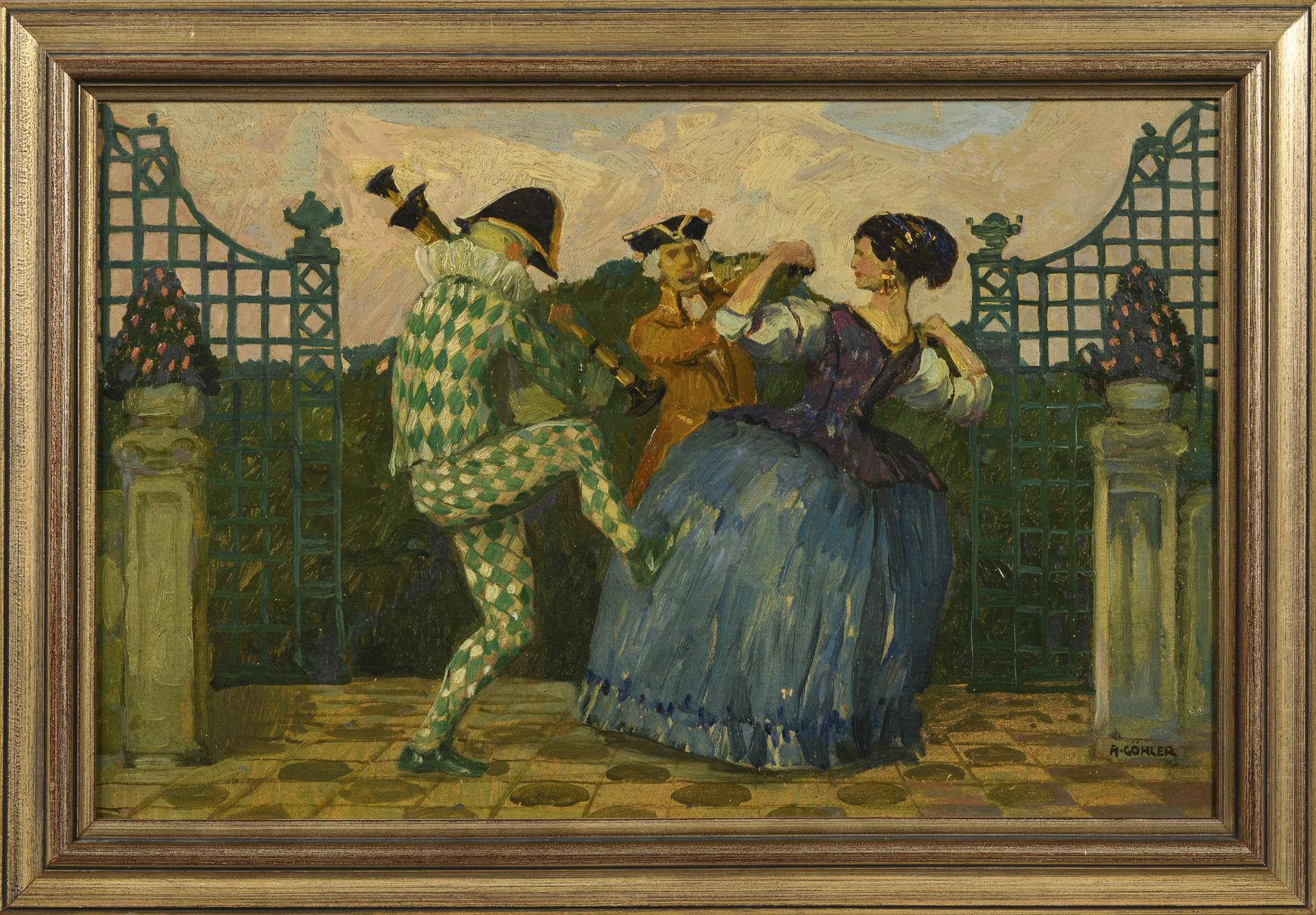 Harlekin beim Musizieren neben einem tanzenden Paar in der Kleidung des Rokoko. Leichte Altersspuren.