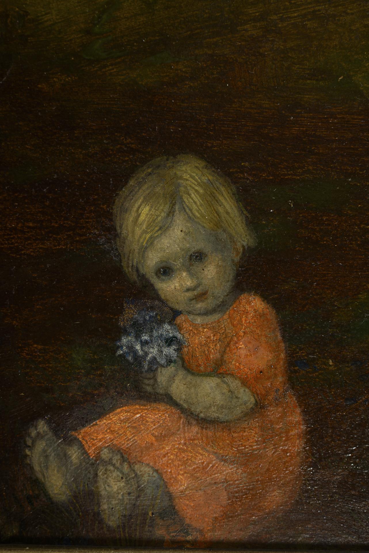 Mädchen in rotem Kleid am Bach unweit des Hauses vor dem Wald. Leichte Altersspuren.