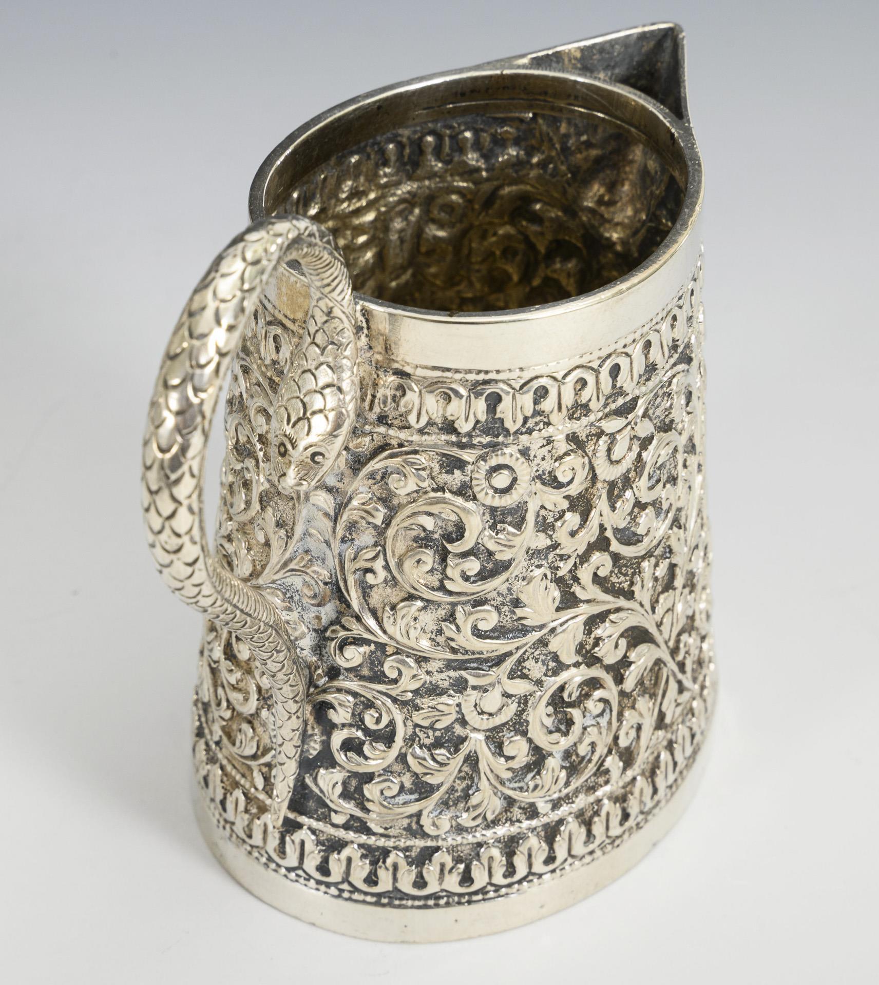 Kaffeekanne mit flachem Scharnierdeckel und Elefantenknauf (H 16 cm), Sahnegießer (H 10,5 cm), Rundschale (Ø 12,5 cm). Floraler Allover-Reliefdekor, Gießgefäße mit Schlangenhenkeln. Leichte Alters- und Gebrauchsspuren, leicht gedellte Ränder.