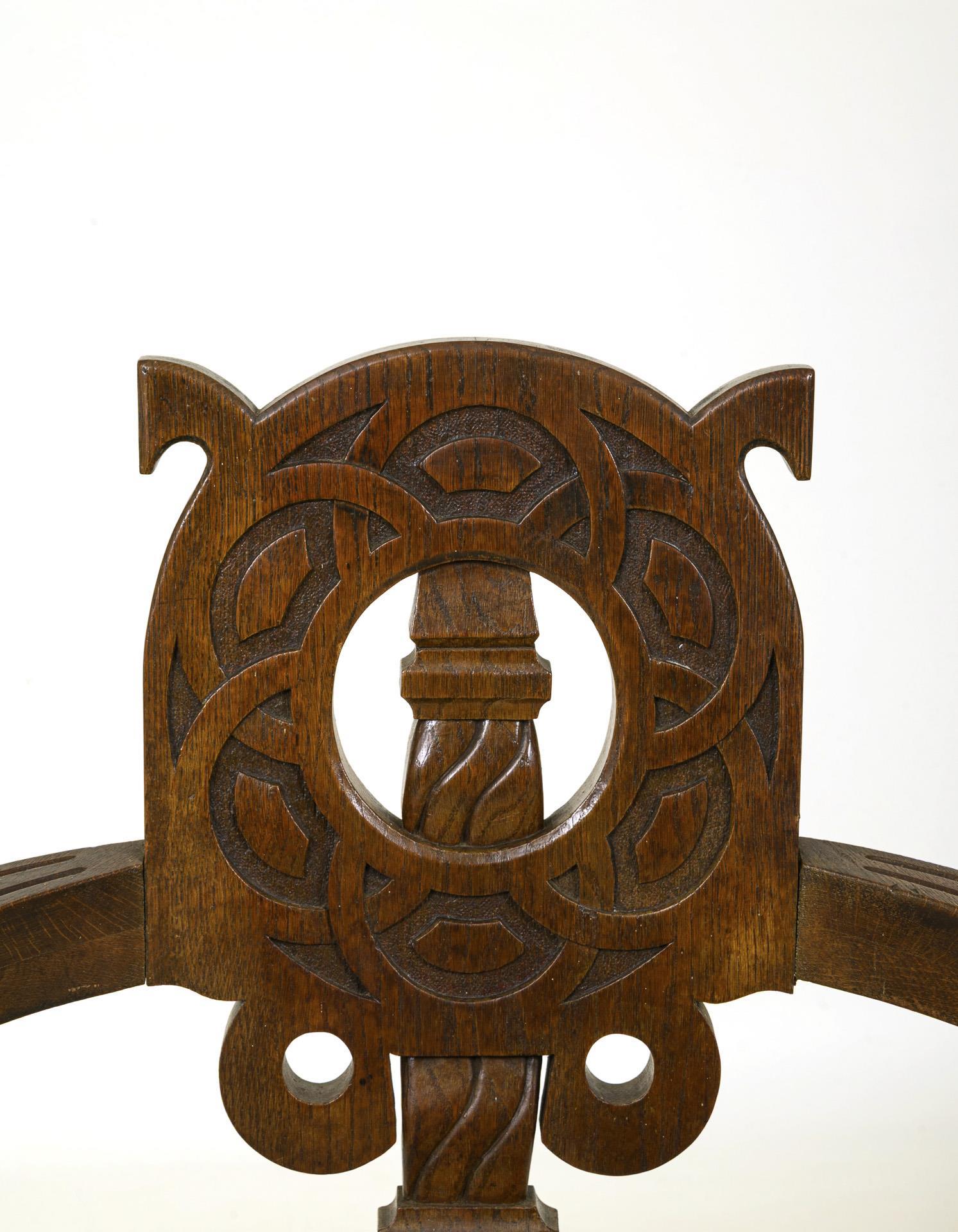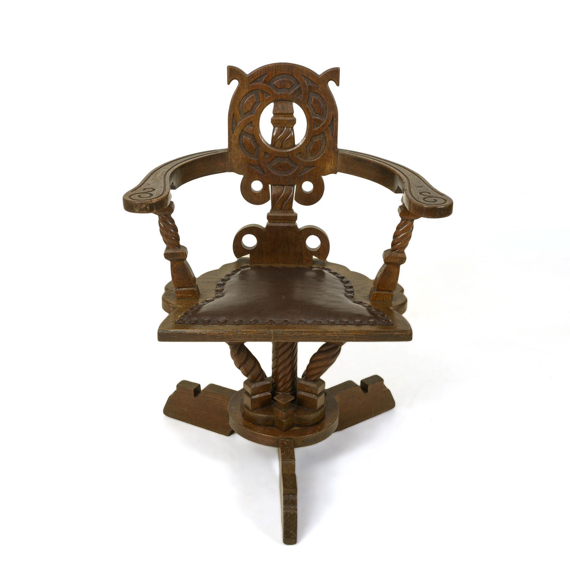 Drehstuhl mit rundbogenförmiger und durchbrochener Rückenlehne, breiten Armstützen, geschweifter Sitzfläche mit gerader Frontkante und leichter Polsterung mit braunem Lederbezug und Polsternägeln, auf tordiertem Säulenschaft mit korrespondierenden Begleitstützen und runder Sockelplatte mit 3 Kufenfüßen. Derbe Kerb- und Schnitzzier, grobe Formensprache mit Bogen- und Kreissegmenten sowie Quadern, Rückenlehne beschnitzt mit einer sechspassigen Rosette. Im Handel oft auch als "Luther-Stuhl" bezeichnet. Leichte Alters- und Gebrauchsspuren, Sitz leicht wackelnd.