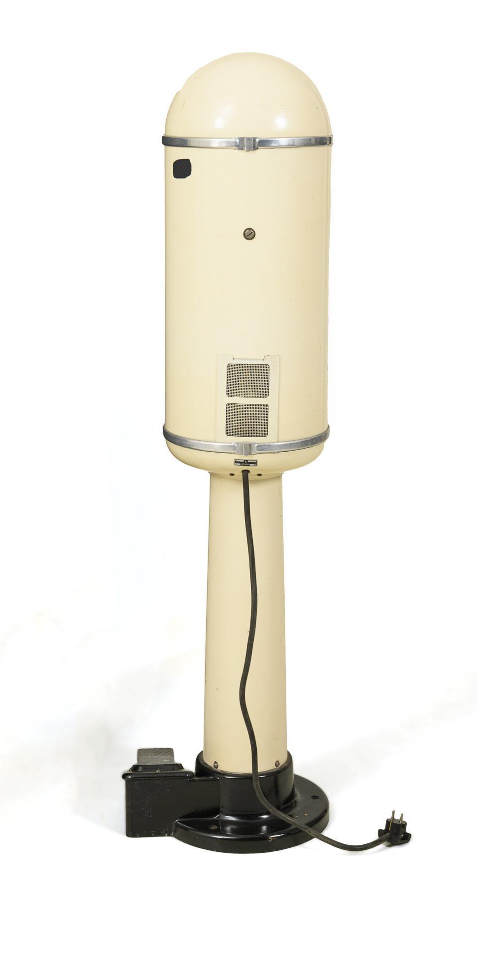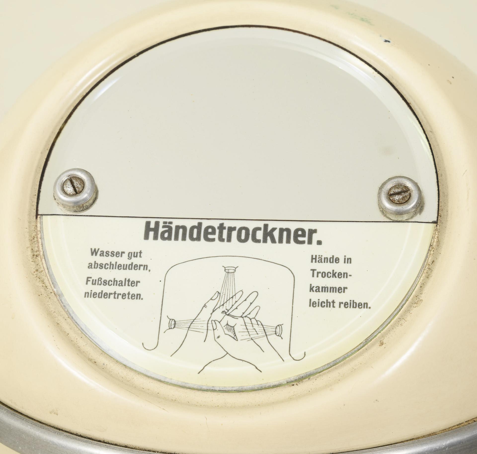 Rundfuß, konischer Säulenschaft, walzenförmiger Korpus mit 3 verchromten Düsen für die Heißluft, oben teils verspiegeltes Glas mit Gebrauchsanleitung. Gusseisenfuß gesprungen, sonst minimale Alters-/Gebrauchsspuren, funktioniert.