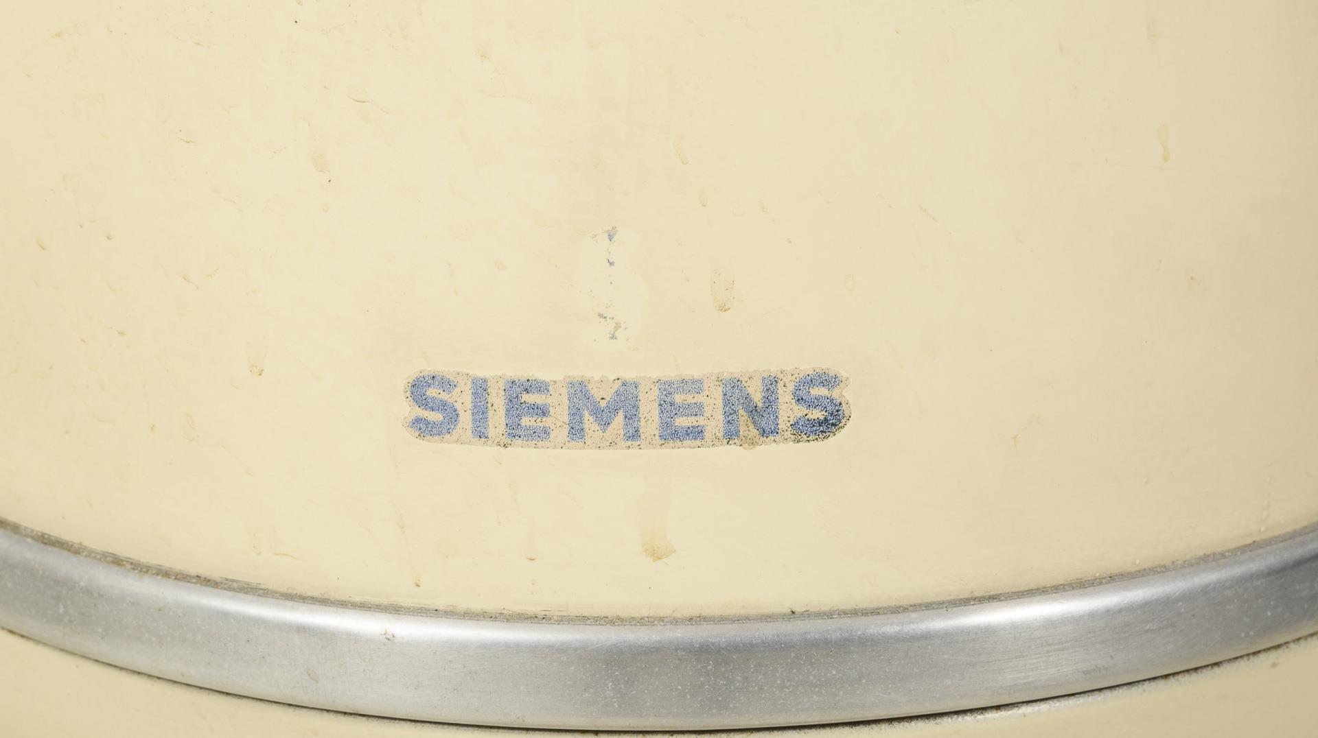 Siemen-Schriftzug, Siemens-Typenschild mit Logo von Siemens & Schuckert (220 V, 1540 W, ETG H8895). 2. Drittel 20. Jh.