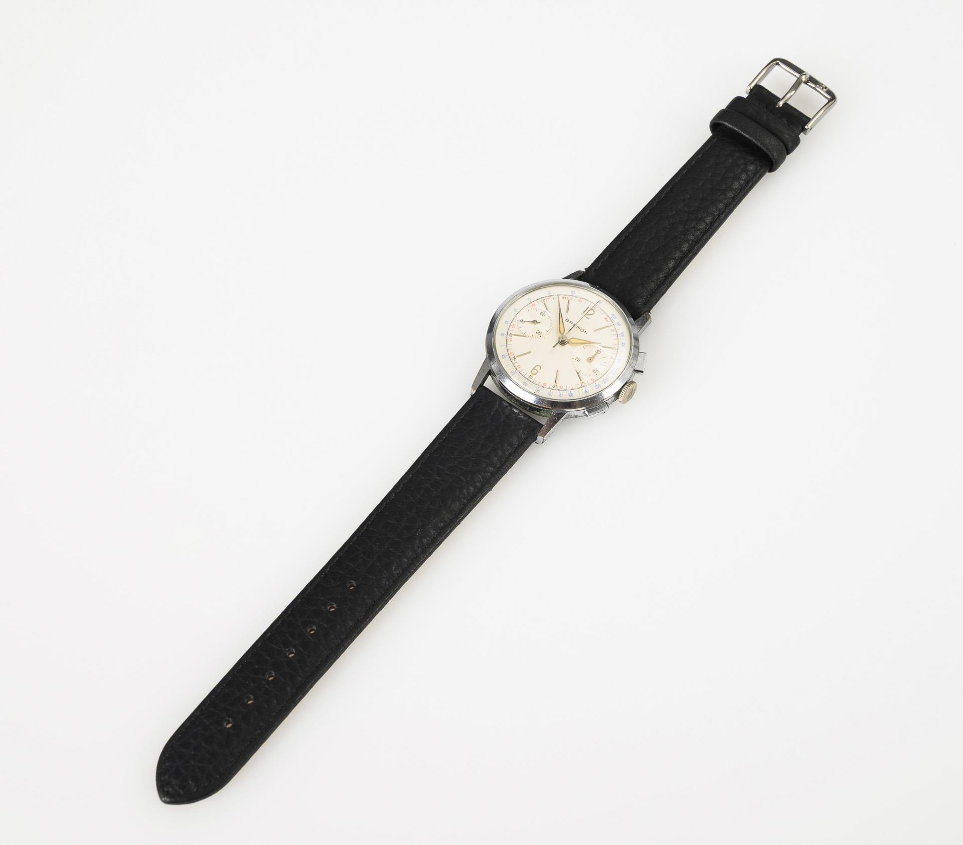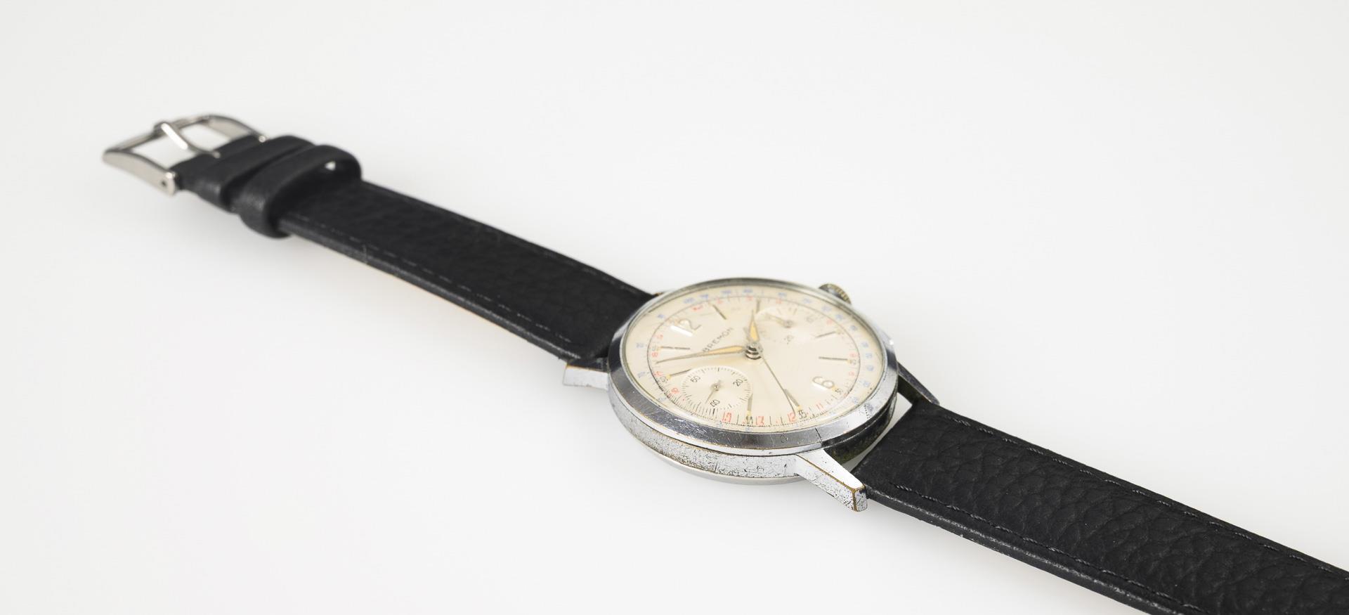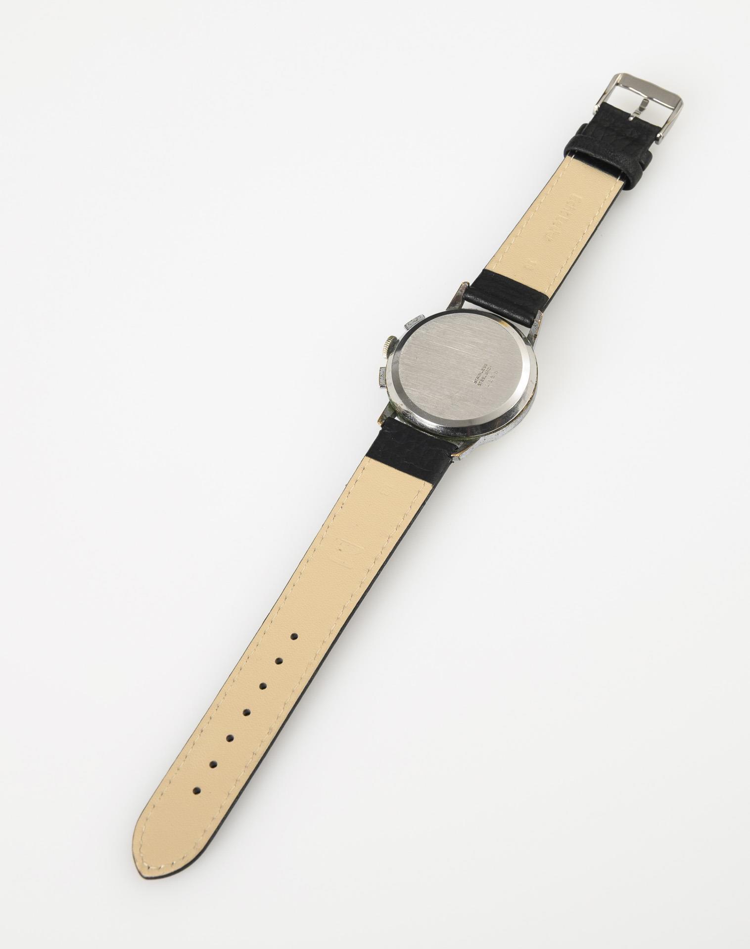 Rundes Gehäuse mit seitlichen Drückern für Chronograph. An ergänztem schwarzem Lederband mit Dornenschließe. Altersspuren, Ziffernglas und Gehäuse mit Kratzspuren, Leuchtmittel nicht mehr fluoreszierend.