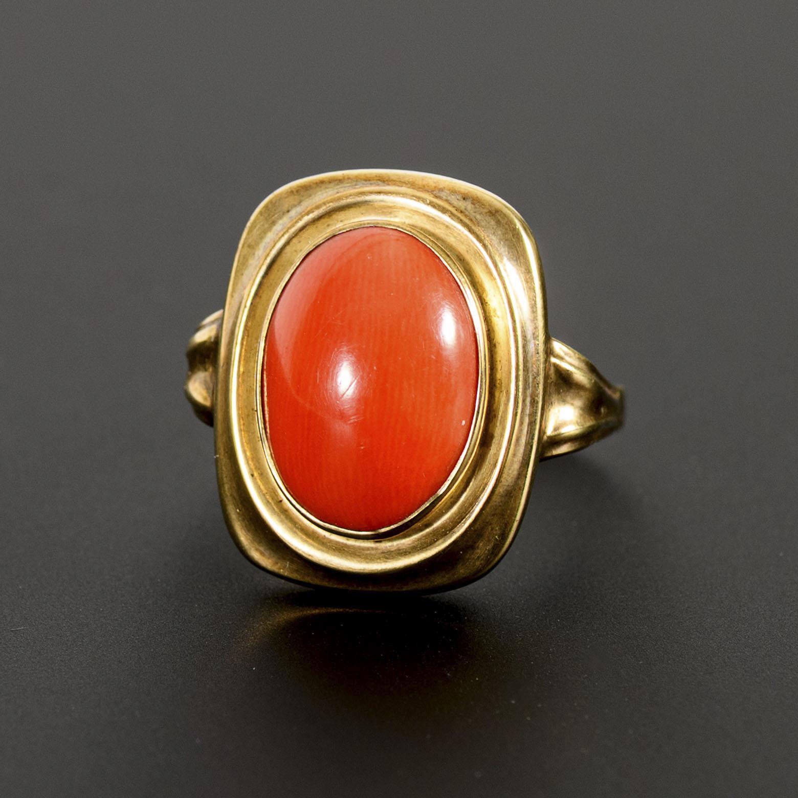 Klassischer Vintage-Ring in klarer Formsprache mit großem Korallen-Cabochon. Altersspuren: das Gold leicht patiniert.