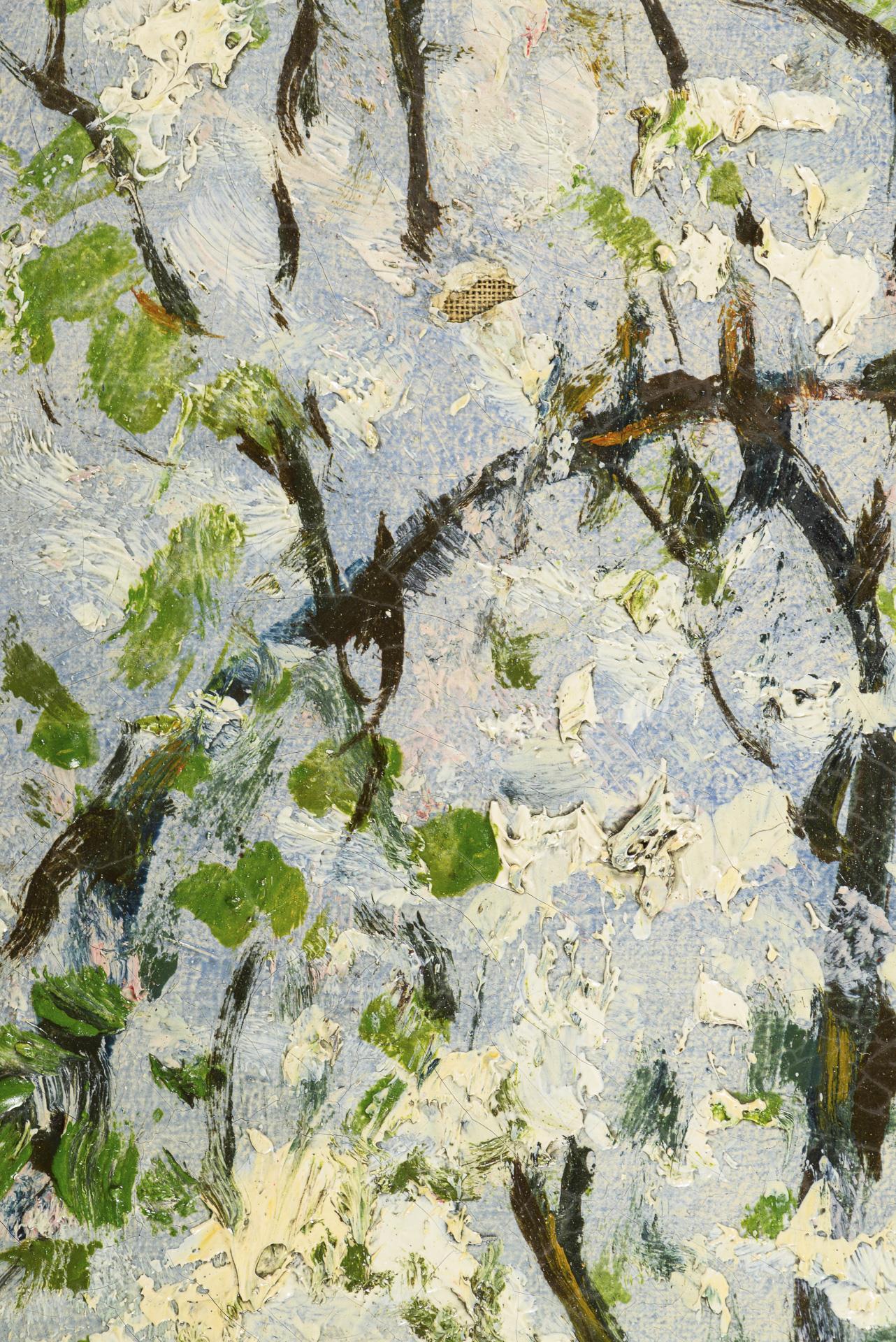 Blühende Obstbäume an leicht abschüssigem Gelände mit zwei Kindern auf der Wiese im Sonnenschein. Leichte Altersspuren.