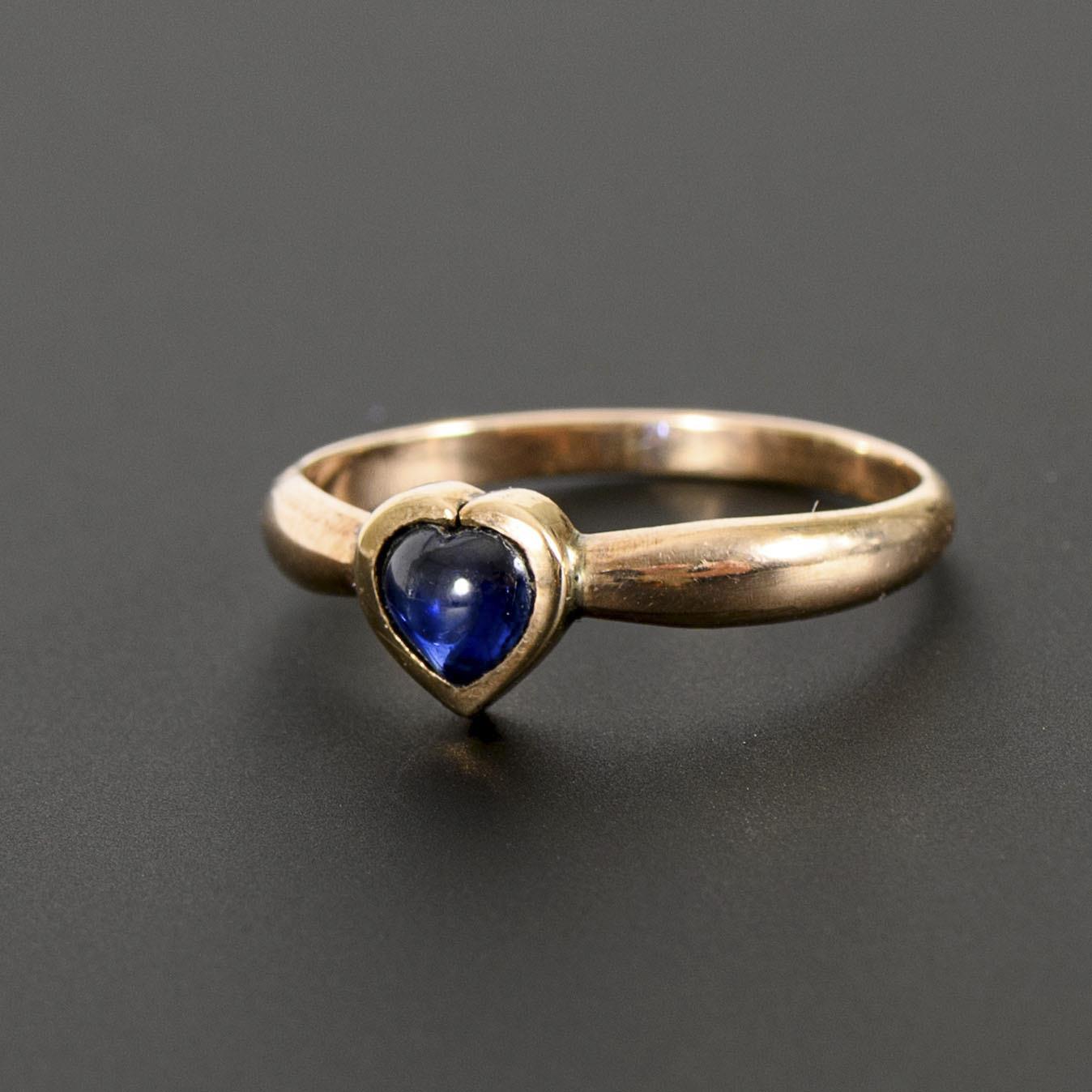 Schlichter Ring mit zargengefasstem blauen Farbstein, wohl Saphir, in Herzform. Das Gold stellenweise minimal angelaufen.