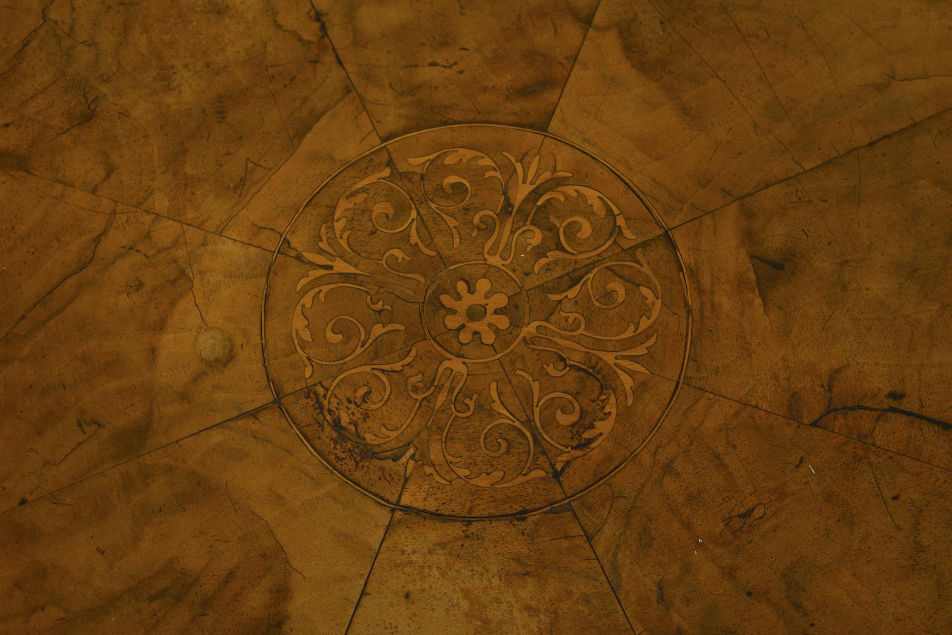 Runde, sternfurnierte Deckplatte mit zentralem Blumenornament und Profilkante, auf gedrechseltem Balusterschaft und 3 geschweiften Füßen. Fehlstellen/Ergänzungen nach Restaurierung, Trockenrisse, Bereibungen.