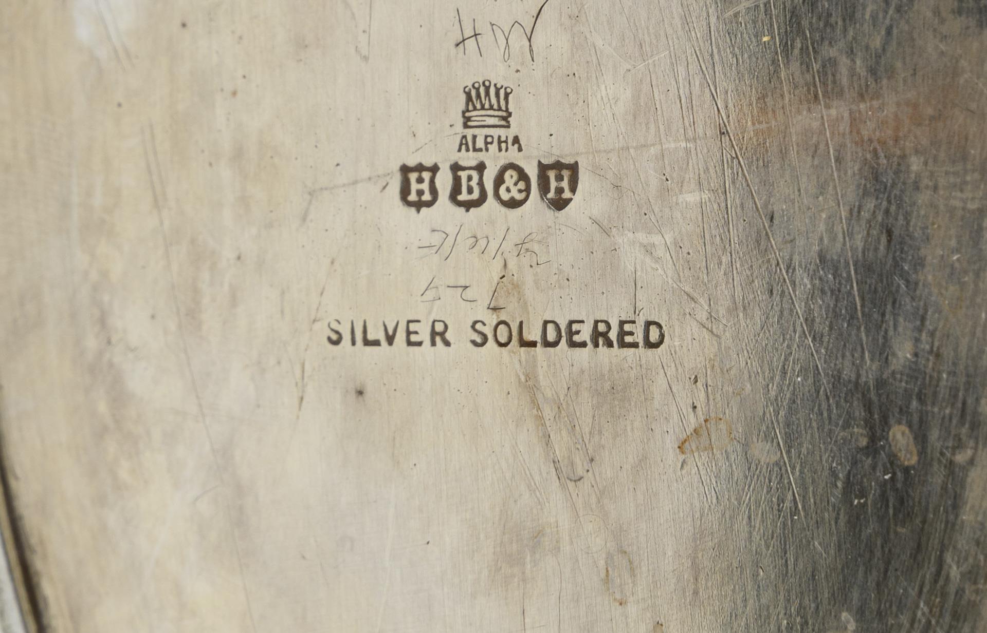 Firmenzeichen Krone Alpha/H B & H gestempelt, mit Zusatz "Silver Soldered". Anfang 20. Jh. Sheffield.