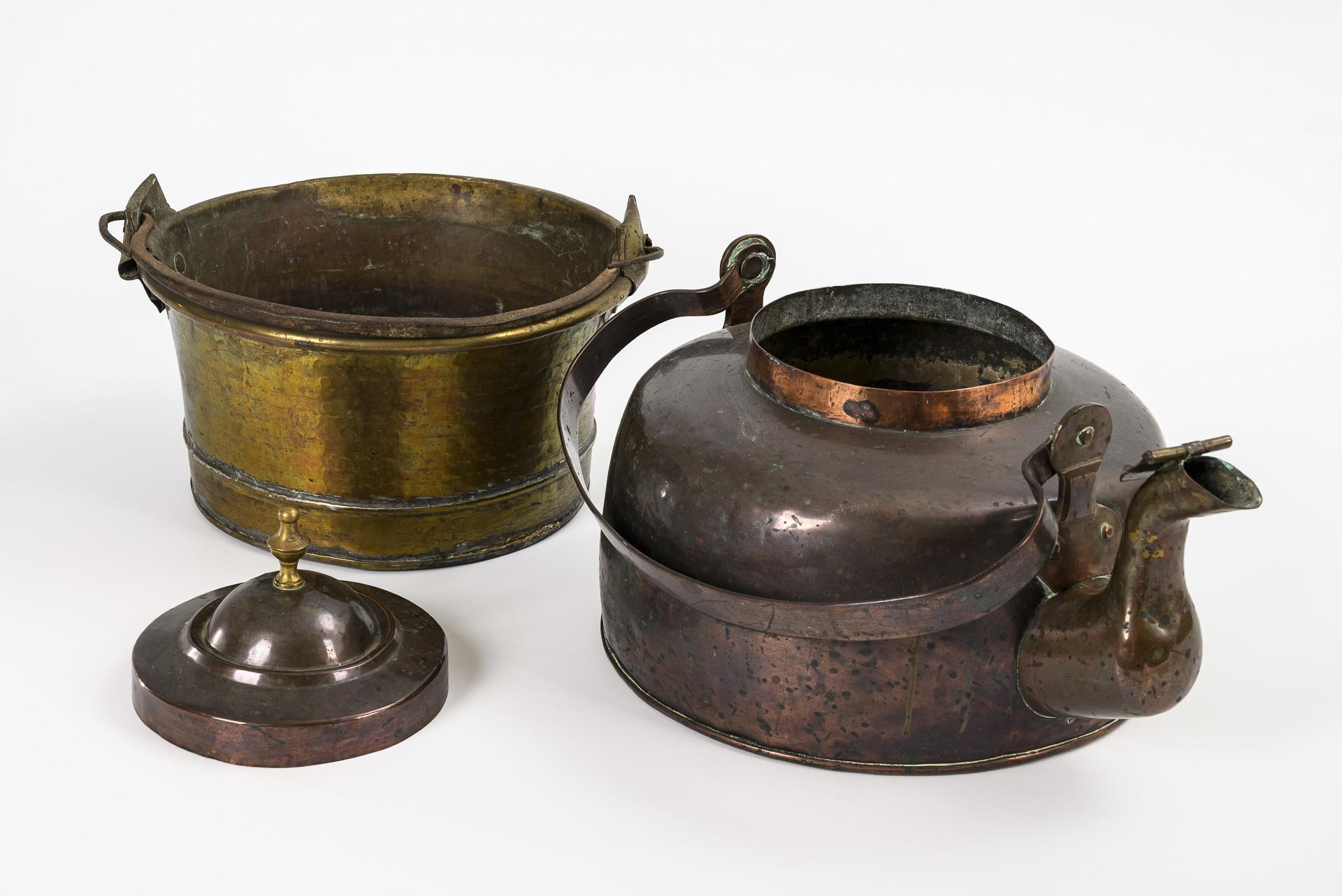 Riesiger Kupferkessel mit Messingknauf auf dem Passdeckel und Scharnierdeckel auf der gewinkelten Tülle sowie scharnierter Tragegriff. Der Korpus mit einer Schränkennaht und angefalztem Boden. / Leicht konischer Eimer mit gebördeltem Rand an der getriebenen Wandung, angefalzten Sockelring und Boden sowie angenietete Attaschen für den Eisenhenkel. Kanne einige leichte Beulen, Eimer starke Beulen, Lötreparaturen an den Falzen und Ergänzungen an den Attaschen; je Kalkablagerungen.