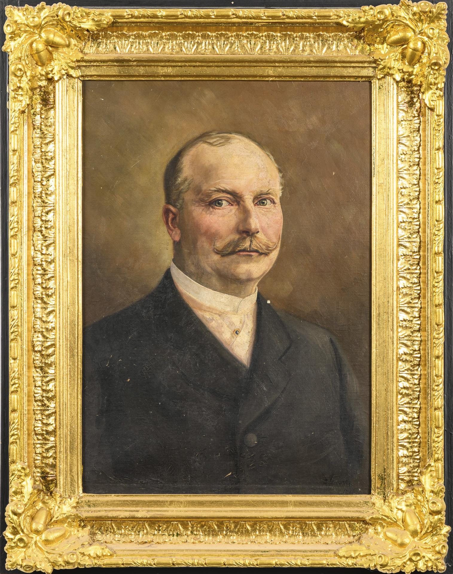 Bildnis eines Mannes mit gezwirbeltem Schnauzbart und im schwarzen Anzug. Leicht verschmutzt.