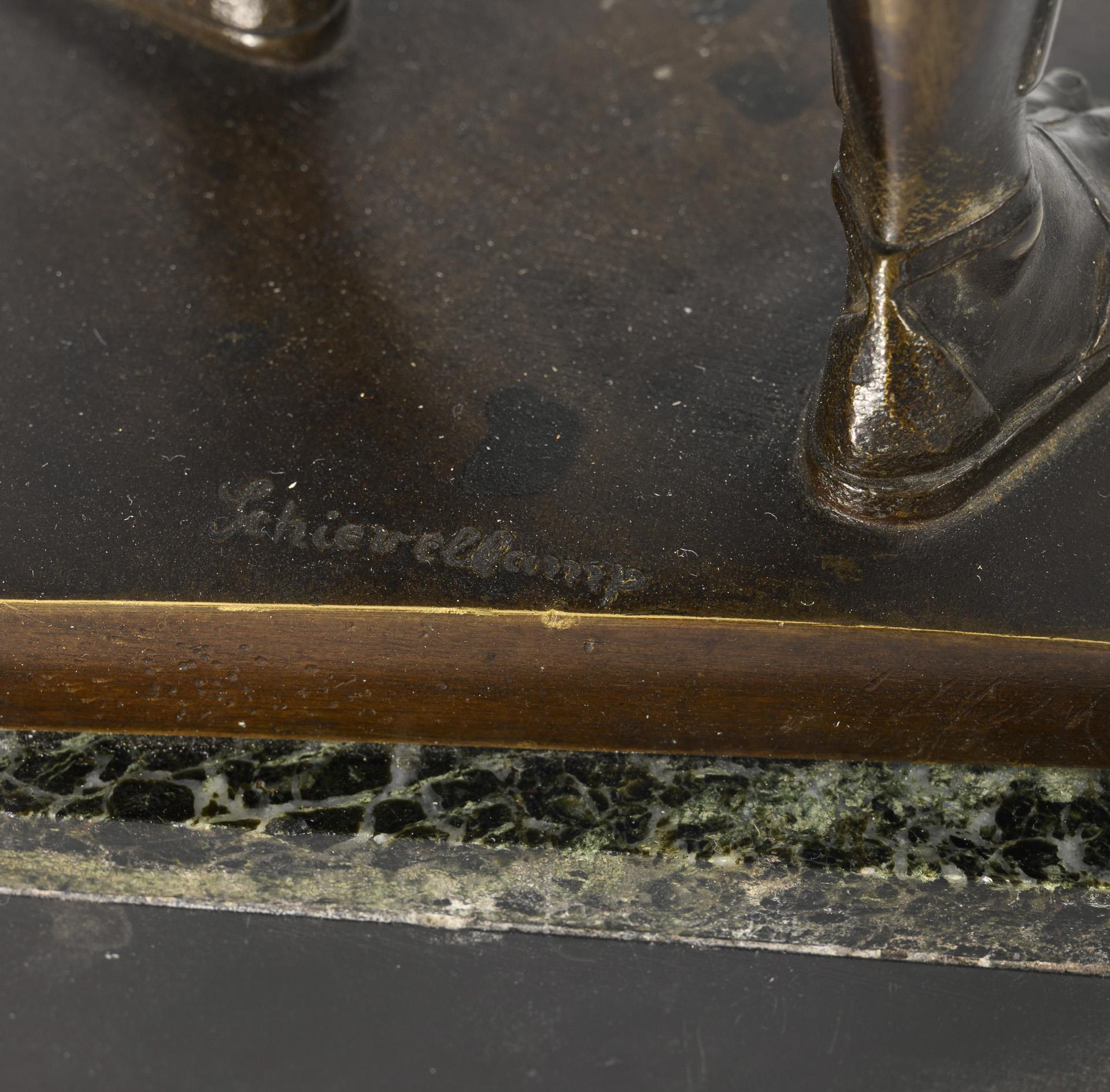 Bronze patiniert, grüner Marmor-Sockel mit Bronzefüßen. Bezeichnet. H 33 / 40 cm. 3,2 kg.