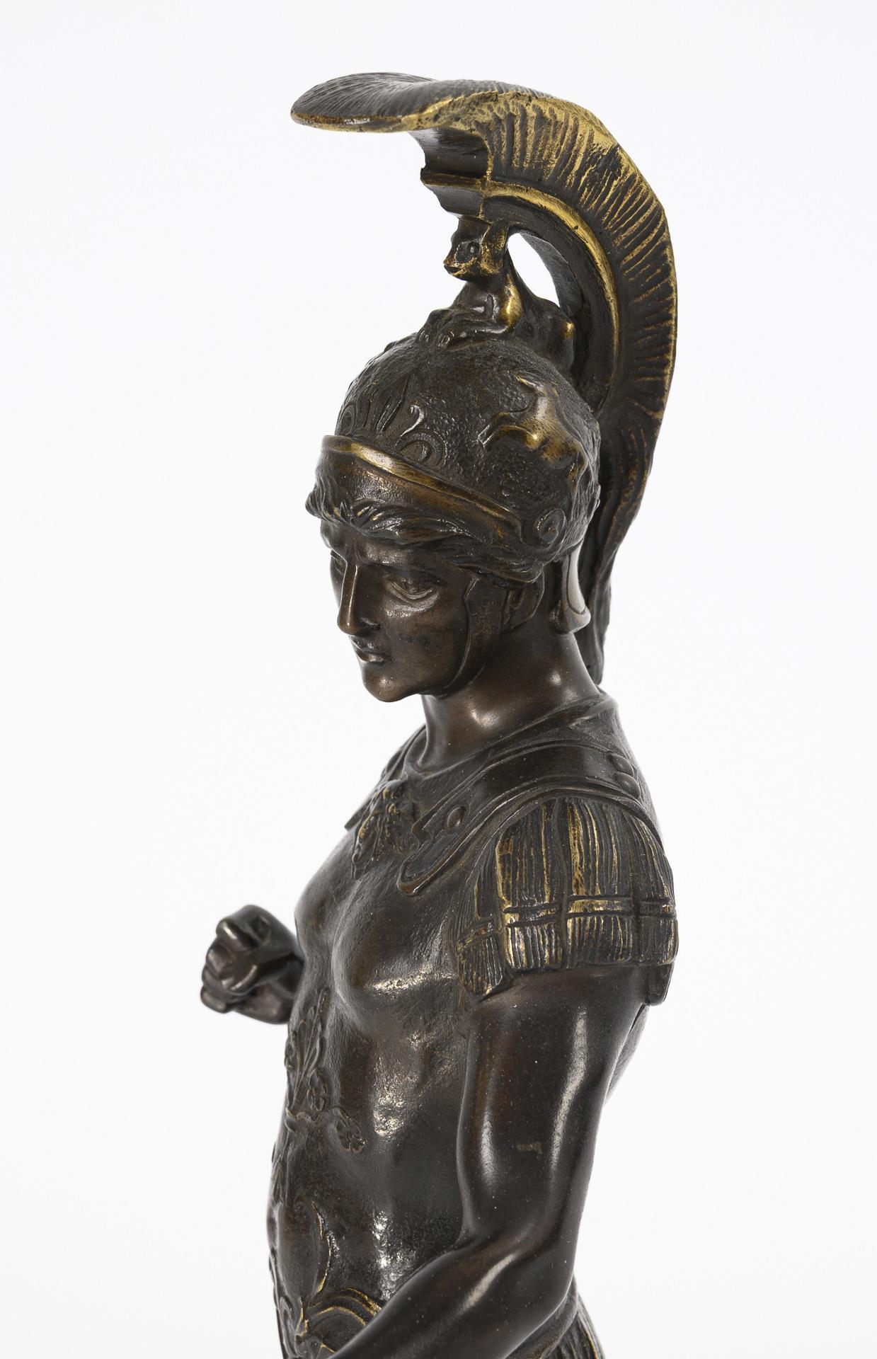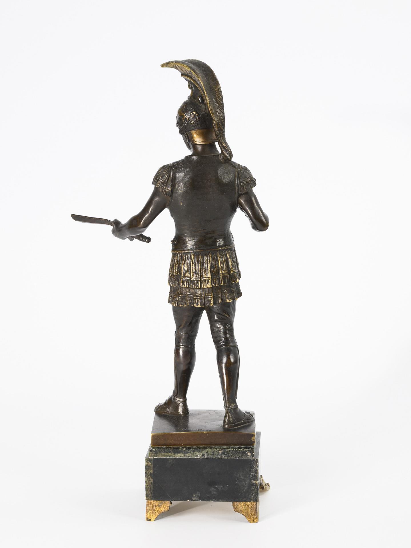 Der stehende Kämpfer in Rüstung mit prachtvollem Raupenhelm hält ein zerbrochenes Schwert vor sich, während er mit der anderen Hand die Faust ballt. Wenige Kerben an der Bronze-Plinthe.