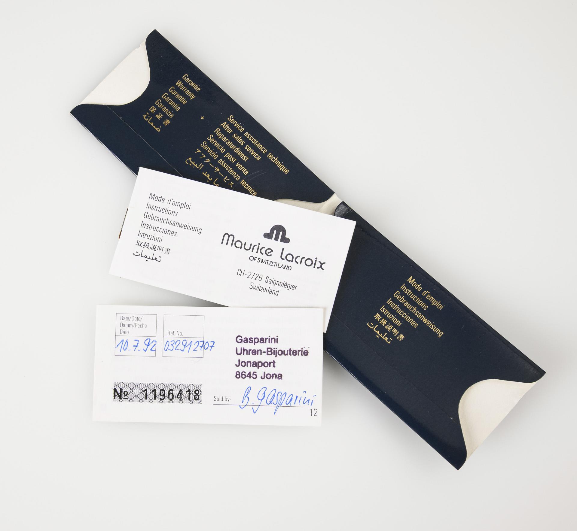 In Original-Etui und Karton mit Garantie-Heft und Gebrauchsanweisung, verkauft am 10.7.1992 durch Gasparini Uhren-Bijouterie in Jona (Schweiz).