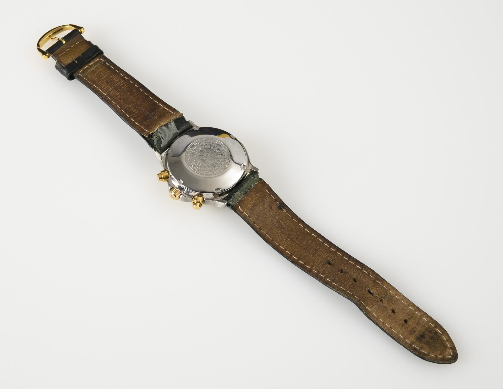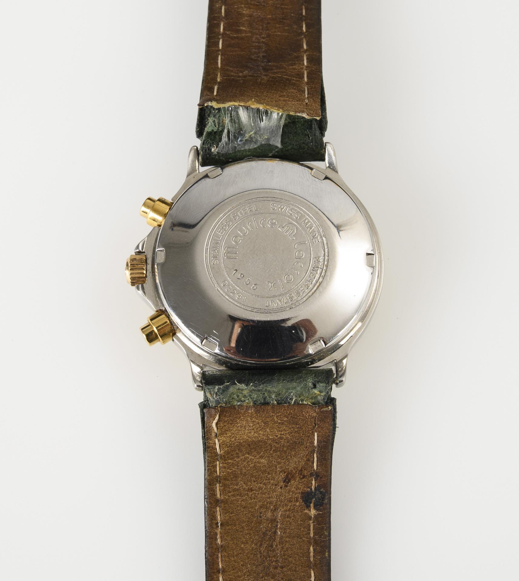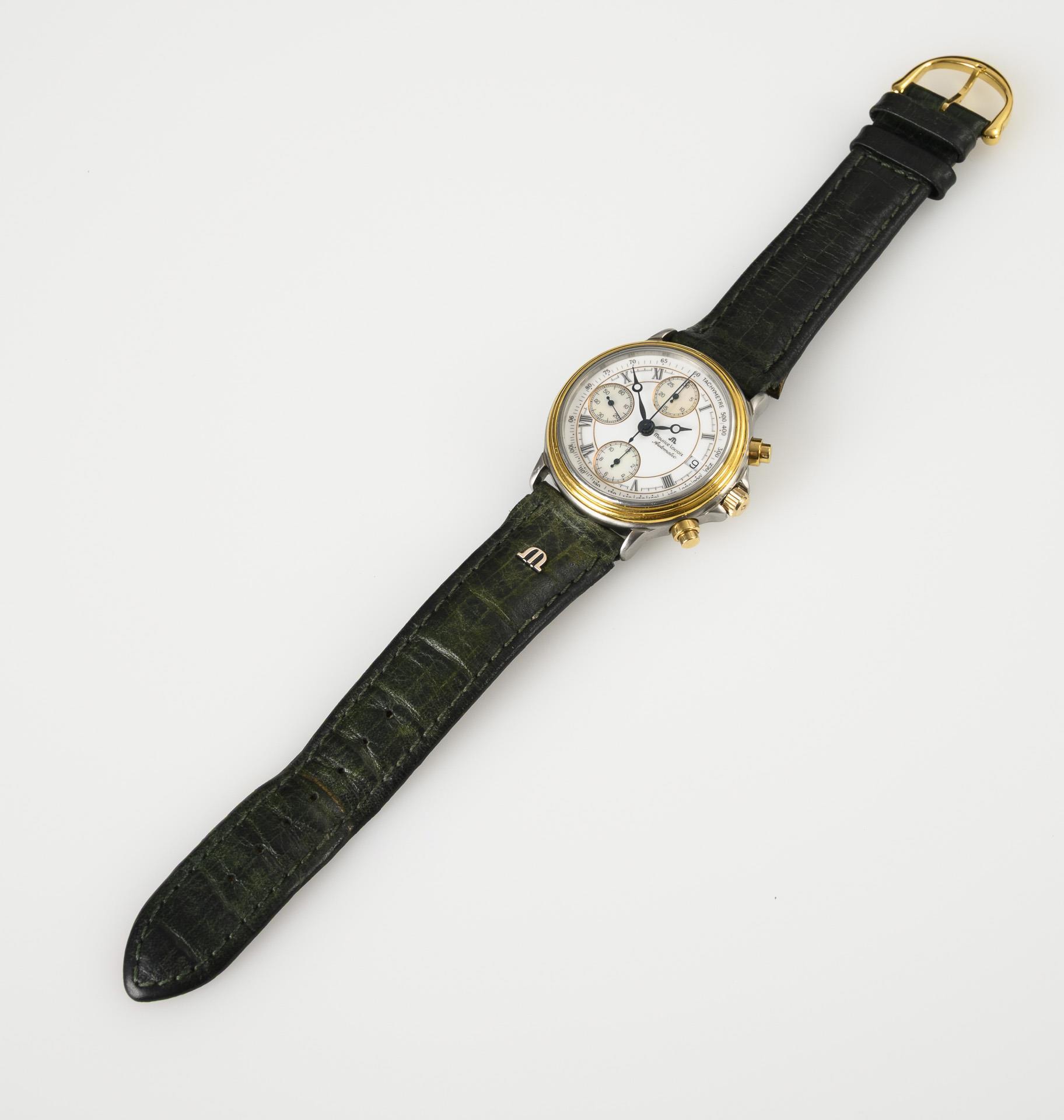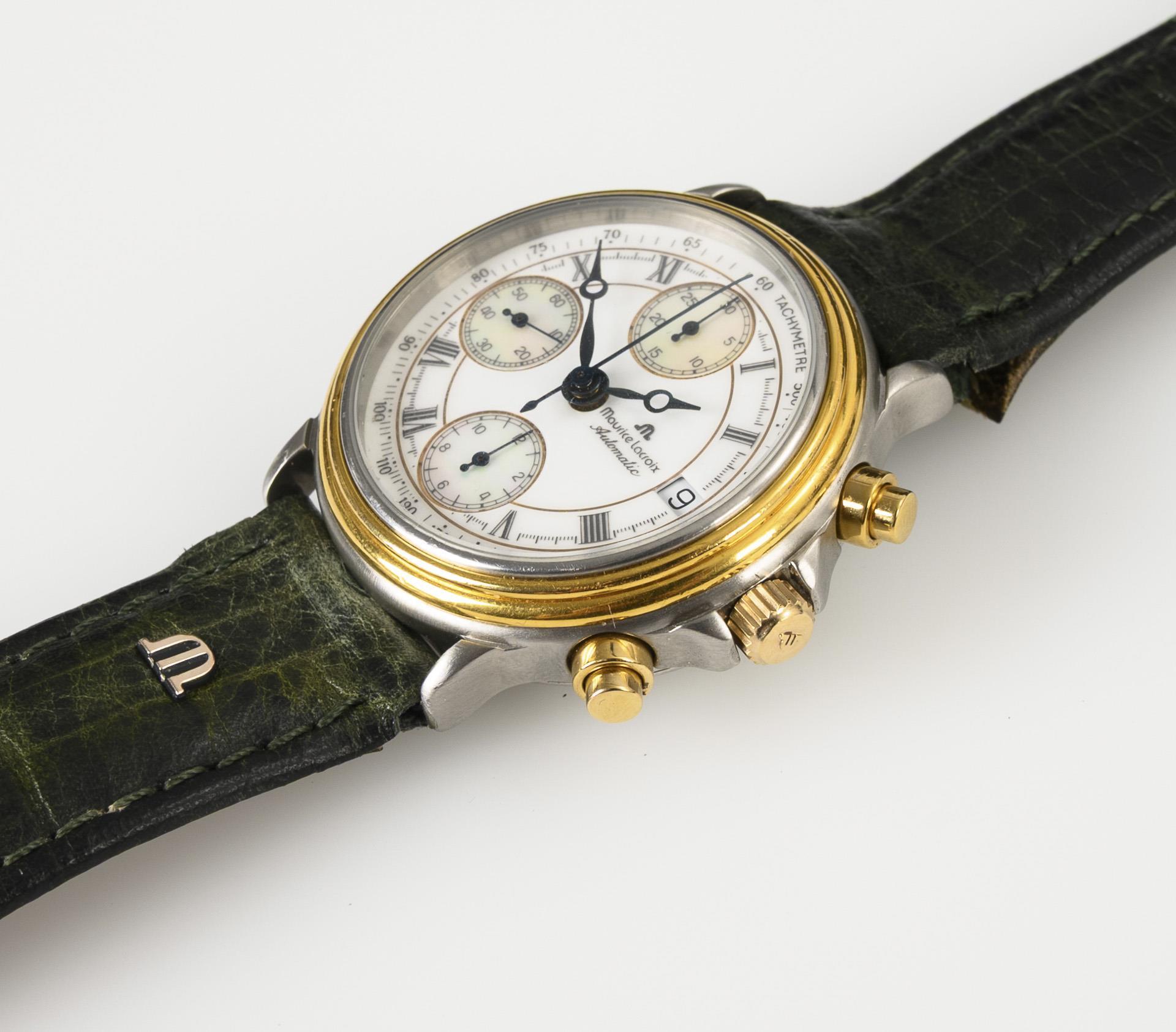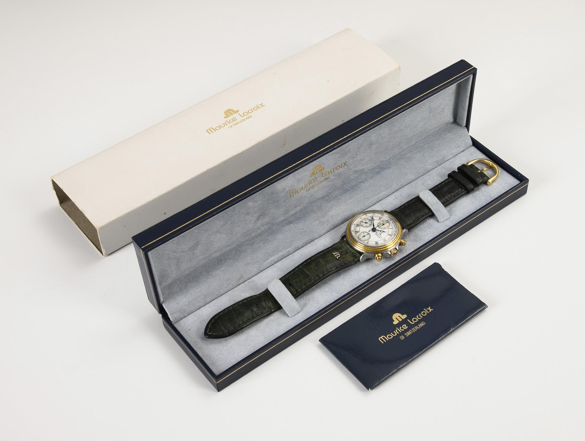 Bicolor-Rundgehäuse mit weißem Ziffernblatt, römischen Stundenindizes, Minutenkranz und 1/5-Sekundeneinteilung, 3 Perlmutt-Hilfsziffernblätter für kleine Sekunde, 30-Minuten und 12-Stunden, Datum bei der 3 mit Schnellschaltung, äußere Tachymeter-Skala bis 500, gebläute Lochzeiger, Chronograph mit Zentralsekunde und seitlichen Stellknöpfen. An grünem Maurice Lacroix-Lederband mit Emblem. Leichte Gebrauchs- und Tragespuren, Armband verso mit Ablösungen.