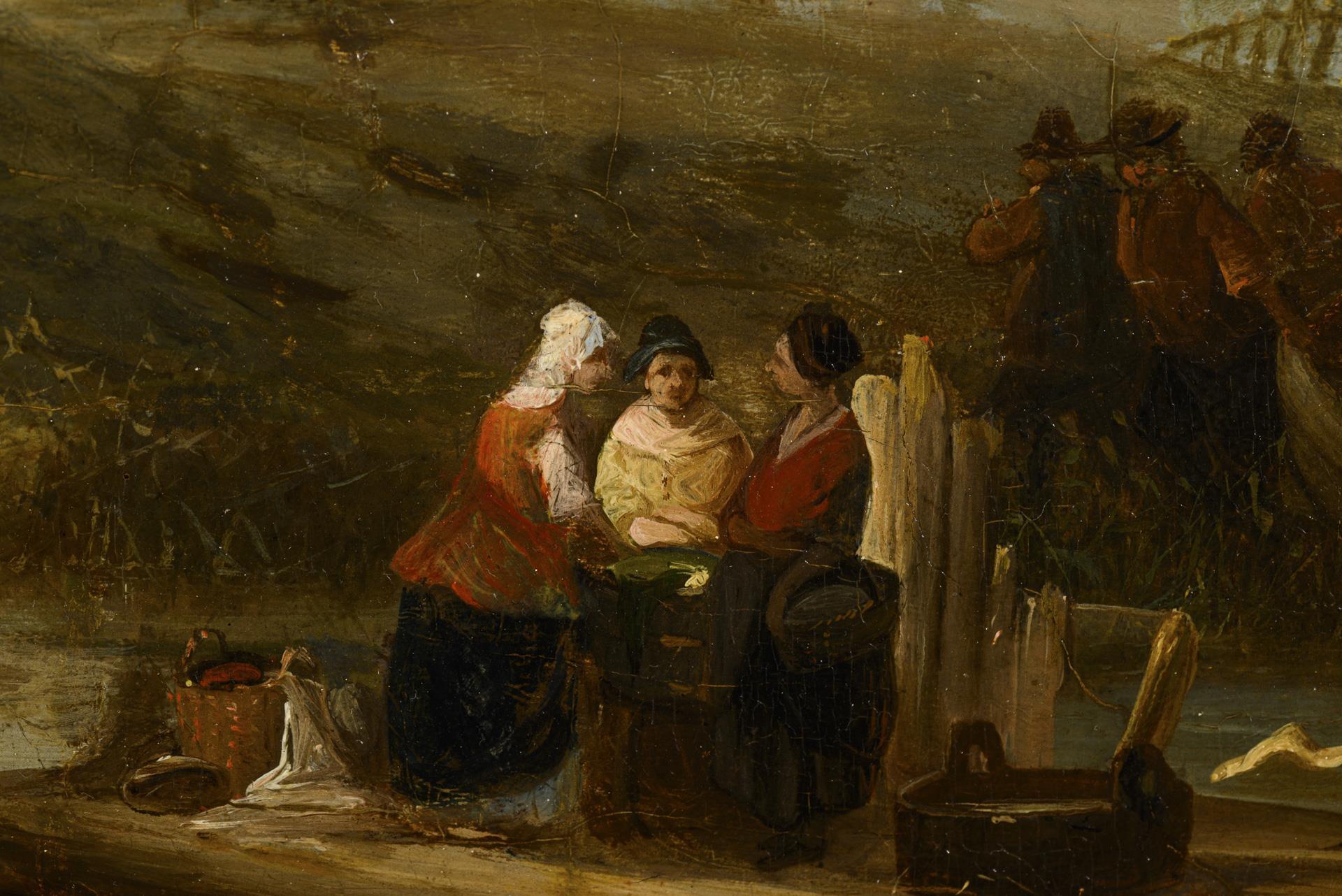 Wäscherinnen und andere Personen am Fluss im Sonnenschein vor den silhouettenhaften Häusern im Hintergrund. Leichte Altersspuren.