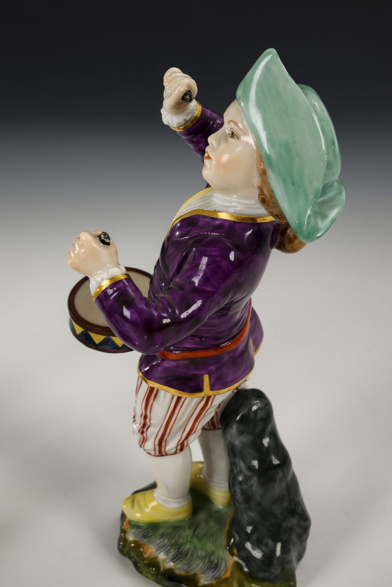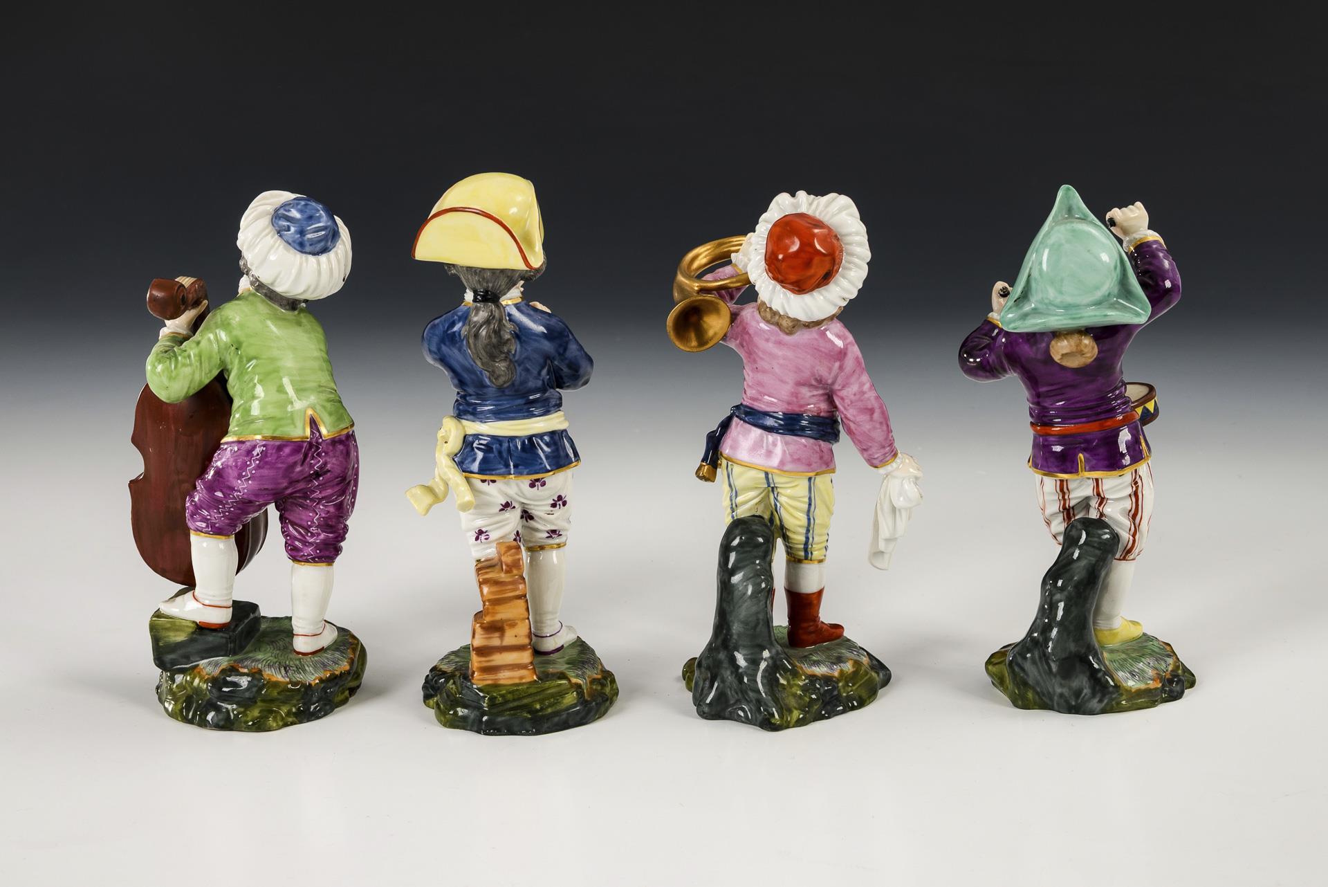2x mit Turban: Kind mit Waldhorn und Kind mit Kontrabass. / 2x mit Dreispitz: Kind mit Trommel und Kind mit Schalmei. Bogenende des Bassisten, Gürtel, rechter Arm und Horn des Waldhornspielers restauriert, Trommelstöcke bestoßen.