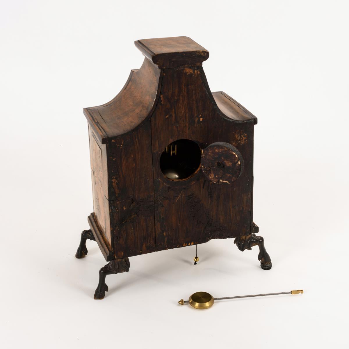 Giebelhäuschen mit verglaster Fronttür und 4 Tierfüßen. Läuft. Altersspuren, Ergänzungen, Pendelfeder fehlt.
