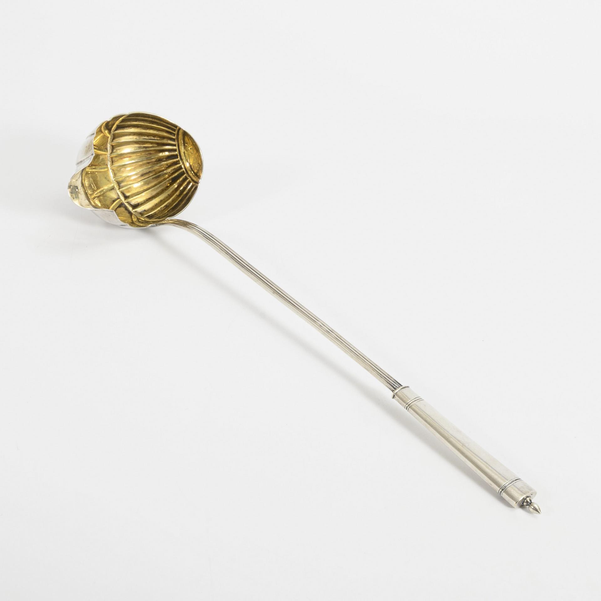Biedermeier-Kelle mit muschelförmigem Schöpfteil und seitlichem Ausguss.