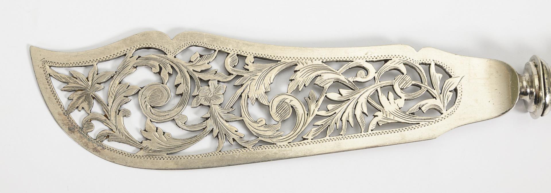 Pasteten- oder Spargelheber, Eismesser und Tortenheber, jeweils floral durchbrochen mit reich verziertem Griff. Tortenheber am Ansatz gelötet.