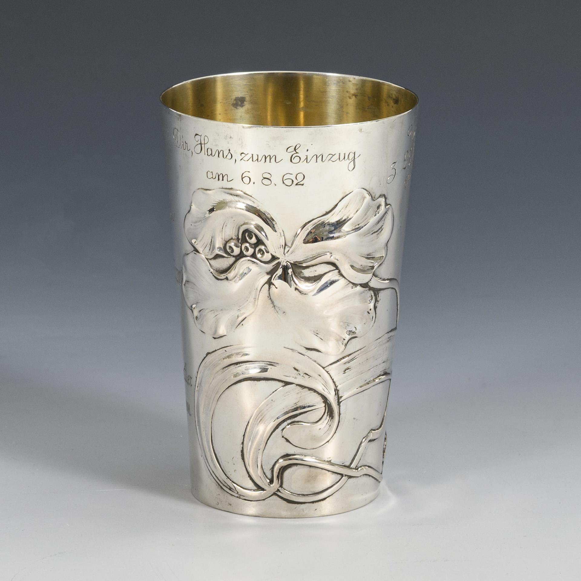 Silberner Jugendstil-Becher mit Widmungsgravuren. Franz Mosgau, Berlin.
