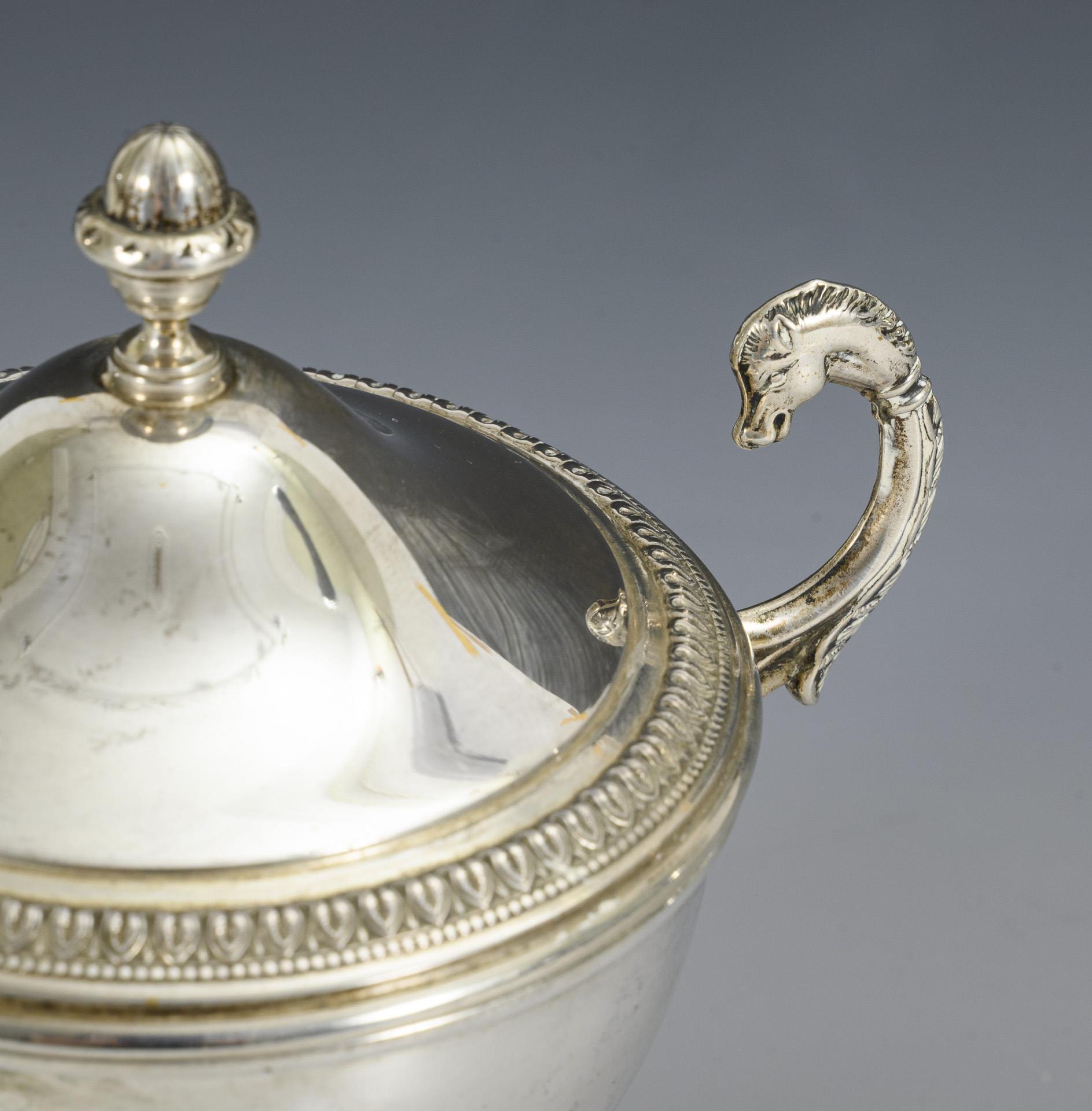 Runde Kuppa mit 2 hoch angesetzten, volutierten Henkeln mit Pferdeköpfen, Deckel mit Eichelknauf und Zungenfries, abgesetzter Rundfuß mit Zungenfries. Innen Kratzspuren, rote Farbmarkierungen, Kuppa mit kleiner Delle.