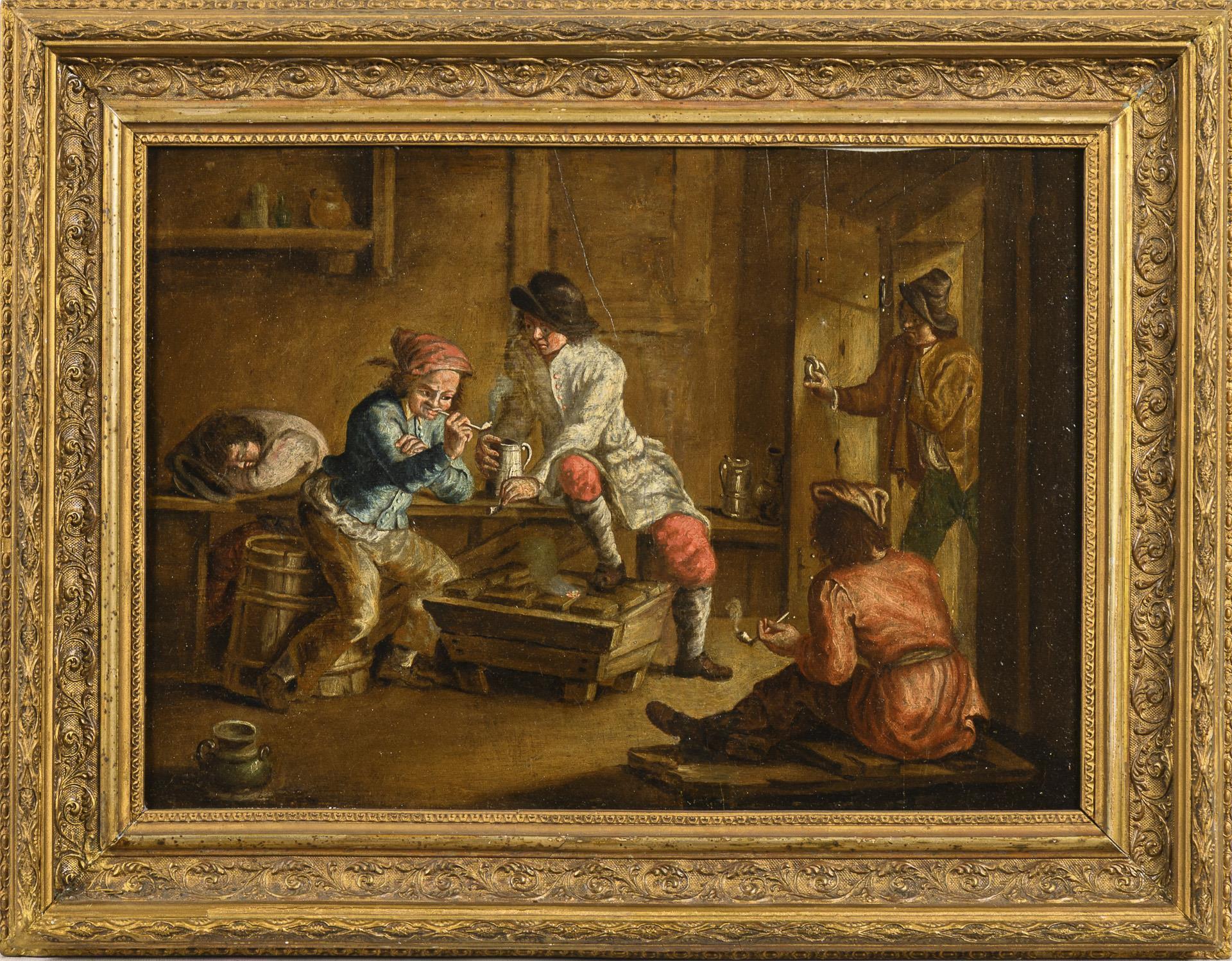 Mehrere Männer in der Stube beim Bier trinken und Pfeife rauchen. Altersspuren.